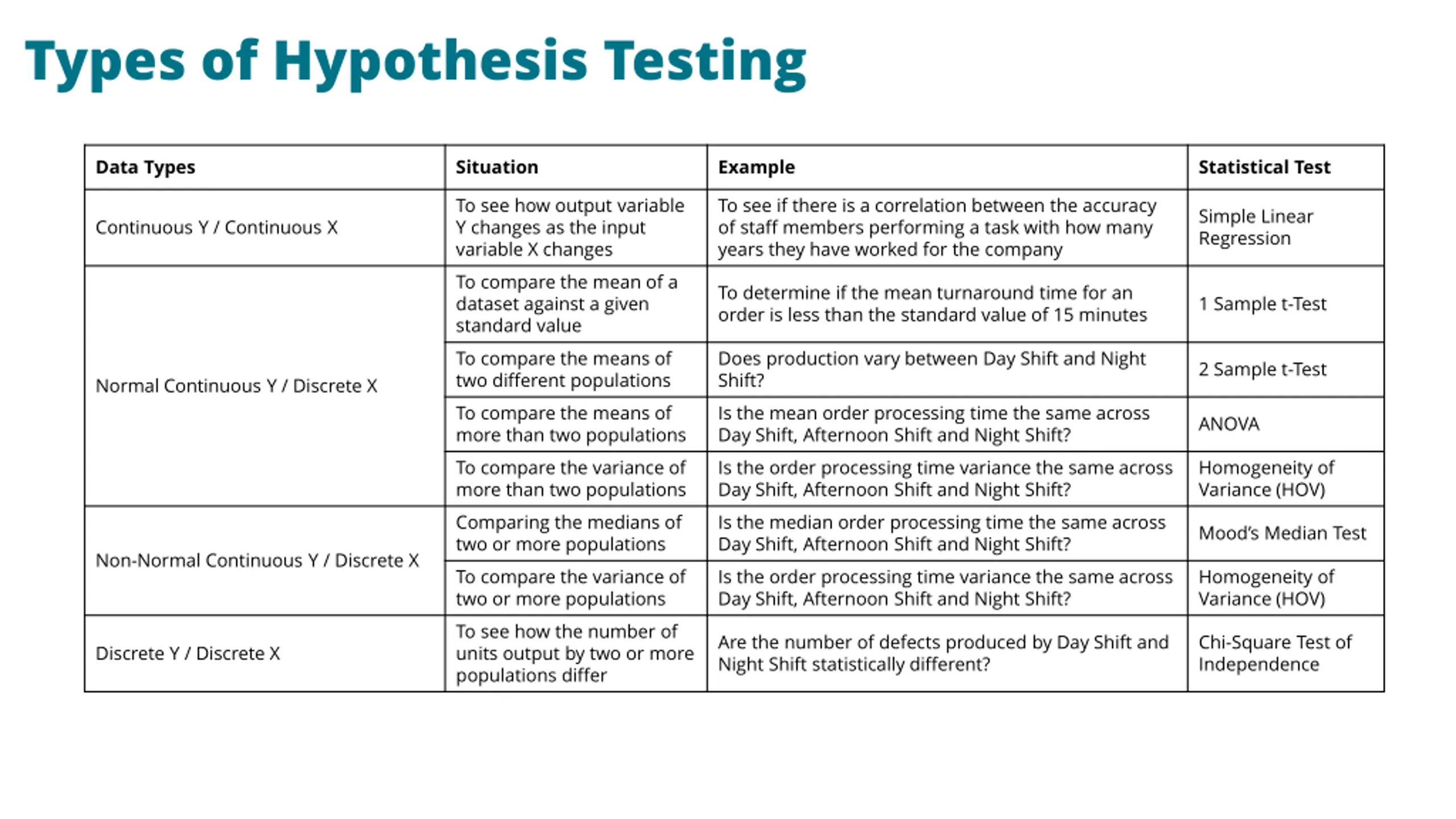 Types of Hypothesis Testing Data Types Situation Example Statistical Test To see how output variable Y changes as the input variable X changes To compare the mean of a dataset against a given standard value To compare the means of two different populations To compare the means of more than two populations To compare the variance of more than two populations Comparing the medians of two or more populations To compare the variance of two or more populations To see how the number of units output by two or more populations differ To see if there is a correlation between the accuracy of staff members performing a task with how many years they have worked for the company Simple Linear Regression Continuous Y / Continuous X To determine if the mean turnaround time for an order is less than the standard value of 15 minutes 1 Sample t-Test Does production vary between Day Shift and Night Shift? Is the mean order processing time the same across Day Shift, Afternoon Shift and Night Shift? Is the order processing time variance the same across Day Shift, Afternoon Shift and Night Shift? Is the median order processing time the same across Day Shift, Afternoon Shift and Night Shift? Is the order processing time variance the same across Day Shift, Afternoon Shift and Night Shift? 2 Sample t-Test Normal Continuous Y / Discrete X ANOVA Homogeneity of Variance (HOV) Mood s Median Test Non-Normal Continuous Y / Discrete X Homogeneity of Variance (HOV) Are the number of defects produced by Day Shift and Night Shift statistically different? Chi-Square Test of Independence Discrete Y / Discrete X