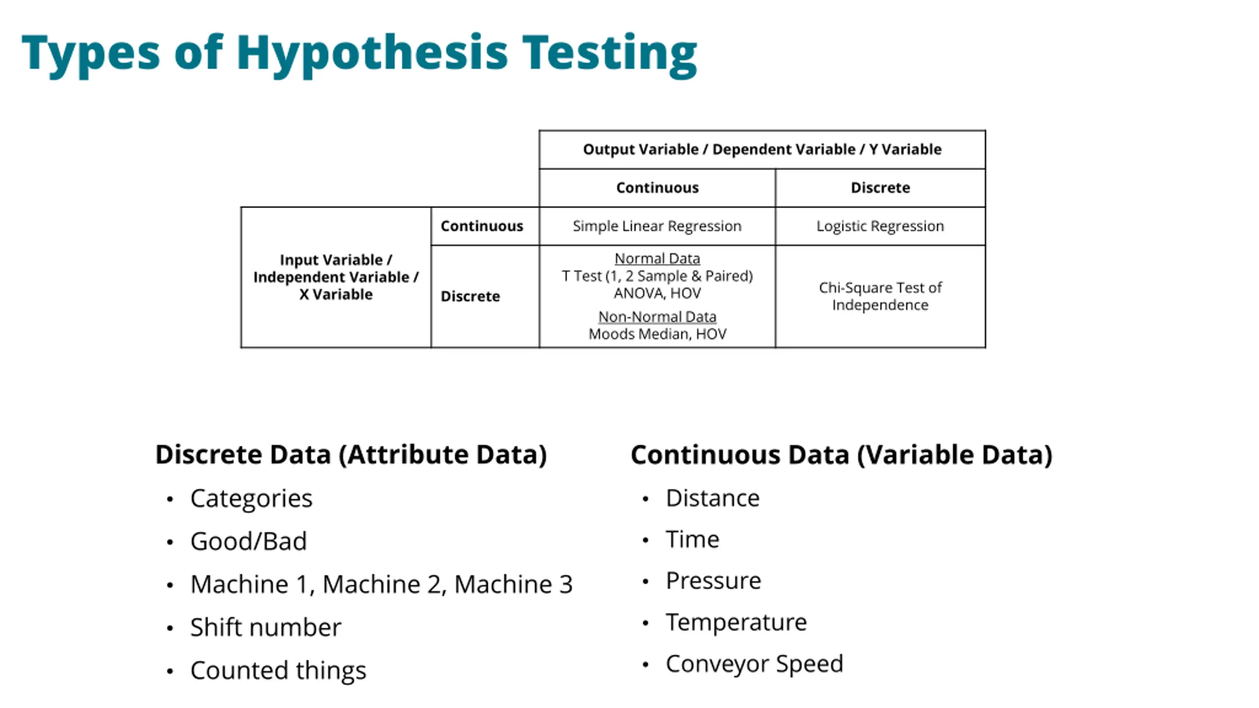 Types of Hypothesis Testing Output Variable / Dependent Variable / Y Variable Continuous Discrete Continuous Simple Linear Regression Logistic Regression Normal Data Input Variable / Independent Variable / X Variable T Test (1, 2 Sample & Paired) ANOVA, HOV Non-Normal Data Moods Median, HOV Chi-Square Test of Independence Discrete Discrete Data (Attribute Data) Categories Good/Bad Machine 1, Machine 2, Machine 3 Shift number Counted things Continuous Data (Variable Data) Distance Time Pressure Temperature Conveyor Speed