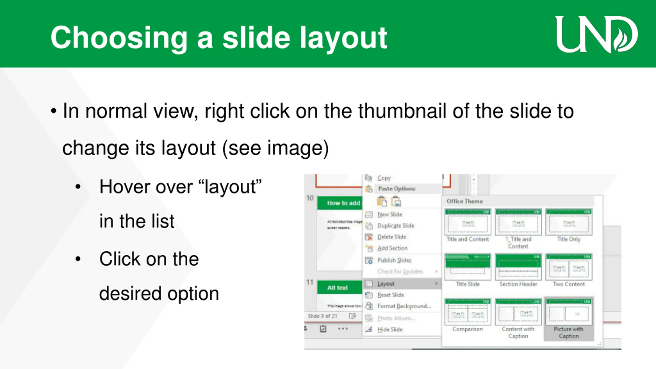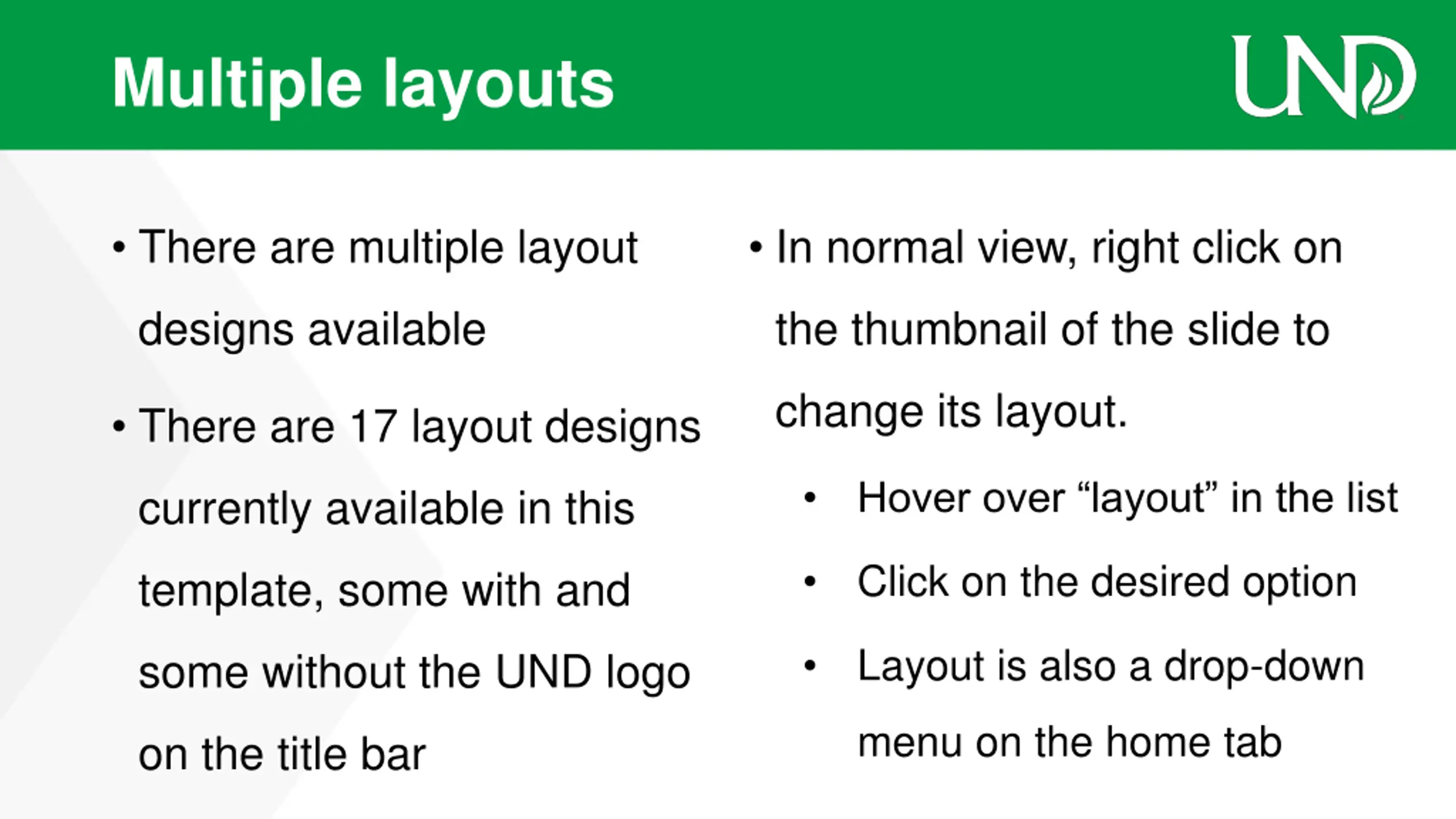Multiple layouts There are multiple layout In normal view, right click on designs available the thumbnail of the slide to change its layout. There are 17 layout designs Hover over layout in the list currently available in this Click on the desired option template, some with and Layout is also a drop-down some without the UND logo menu on the home tab on the title bar