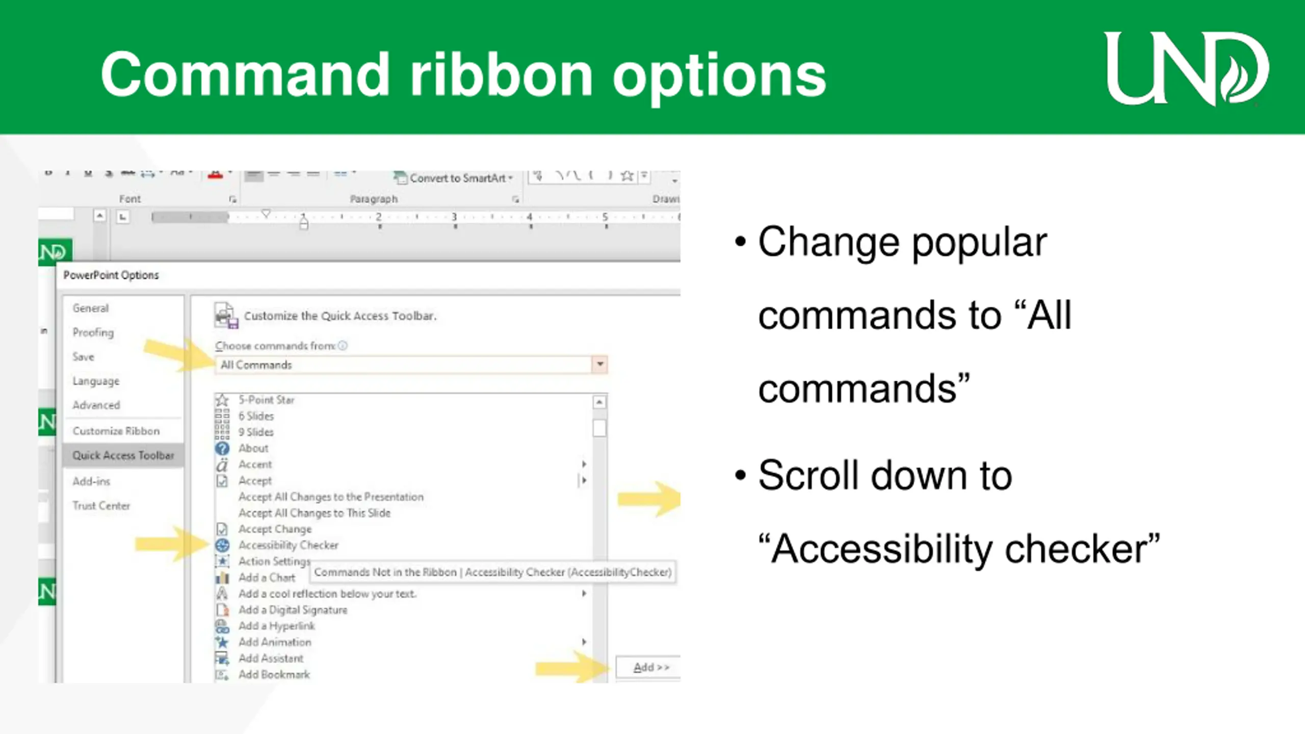 Adding to the command ribbon Select Accessibility checker Click add The new command will display in the right panel.