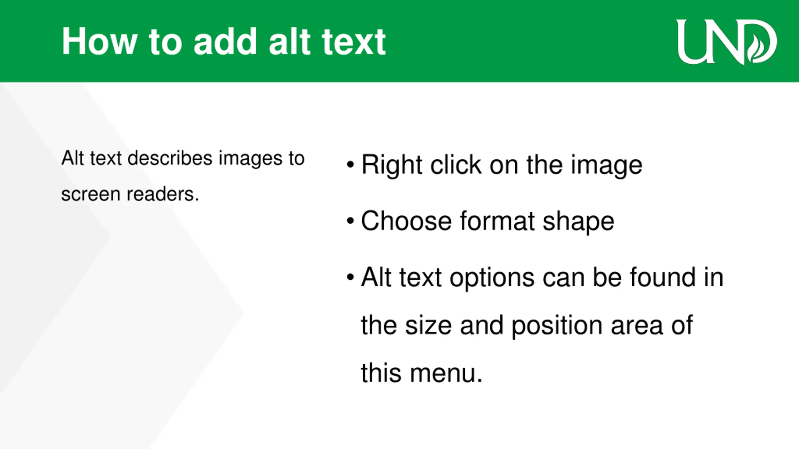 How to add alt text Alt text describes images to Right click on the image screen readers. Choose format shape Alt text options can be found in the size and position area of this menu.