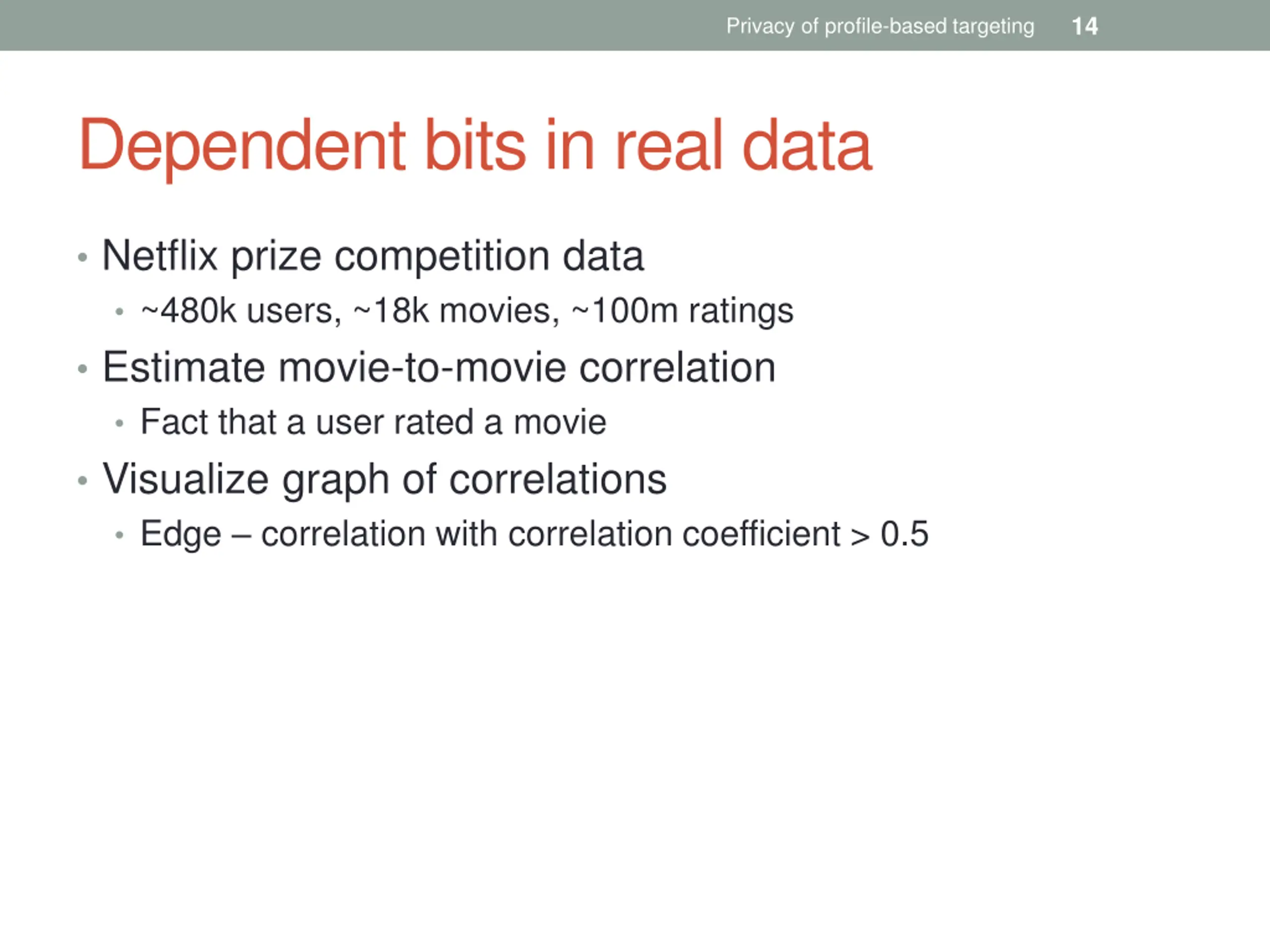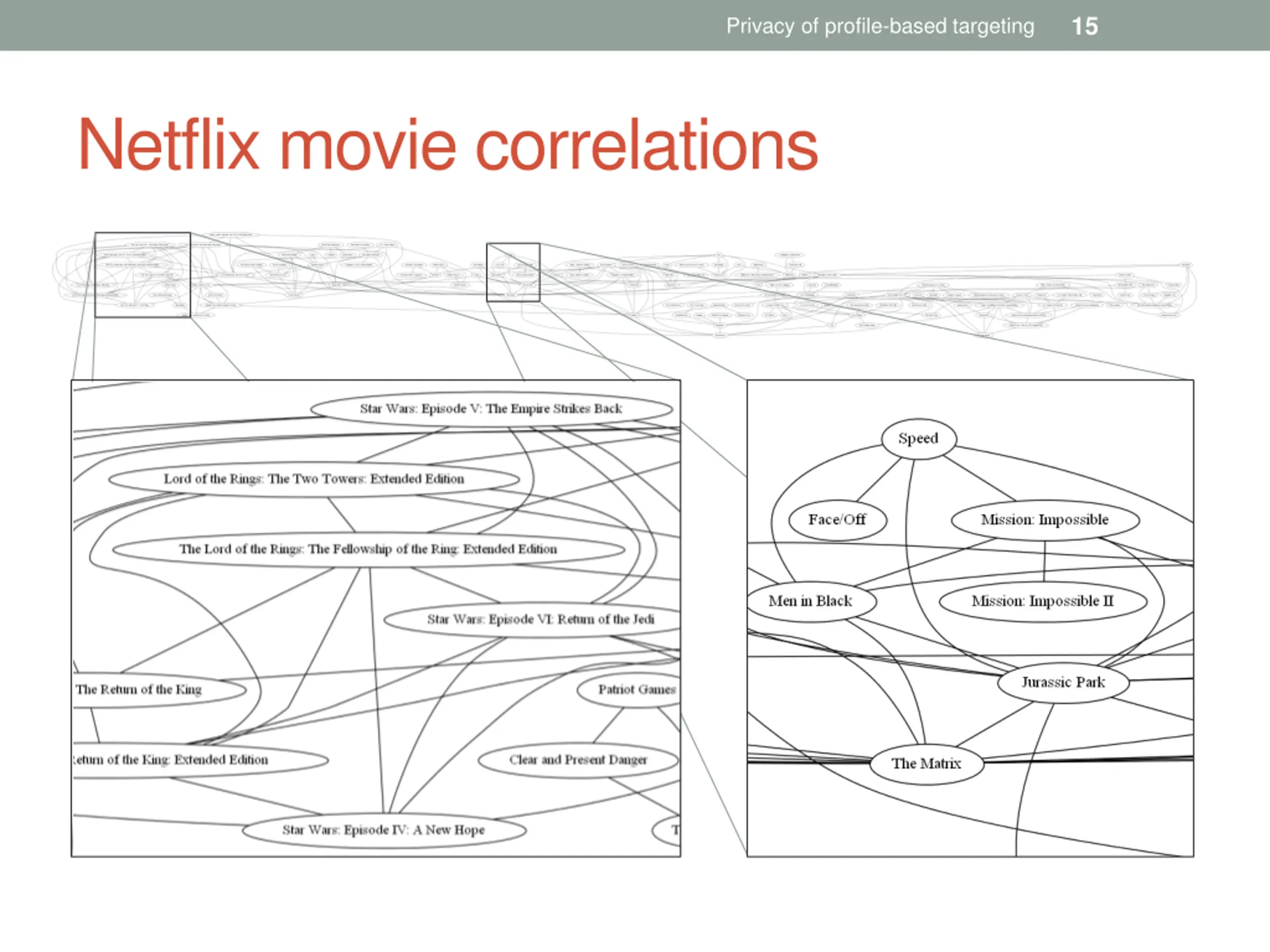 14 Privacy of profile-based targeting Dependent bits in real data Netflix prize competition data ~480k users, ~18k movies, ~100m ratings Estimate movie-to-movie correlation Fact that a user rated a movie Visualize graph of correlations Edge correlation with correlation coefficient > 0.5