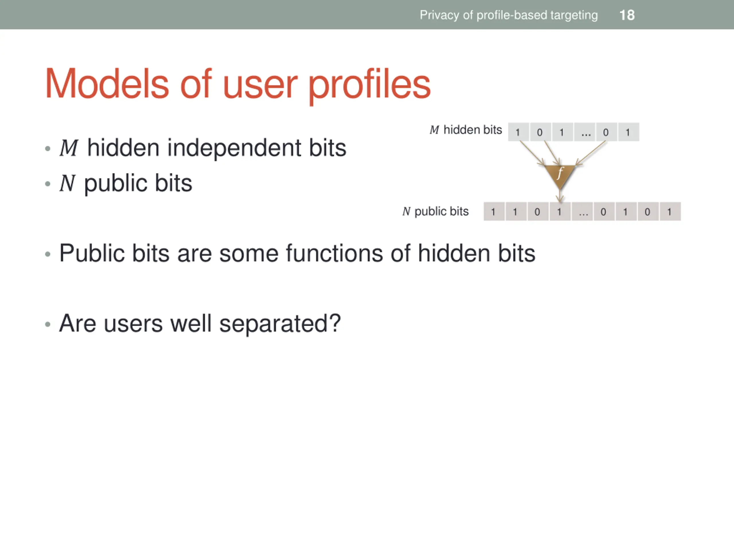 18 Privacy of profile-based targeting Models of user profiles ? hidden bits 1 0 1 0 1 ? hidden independent bits ? public bits ? ? public bits 1 1 0 1 0 1 0 1 Public bits are some functions of hidden bits Are users well separated?