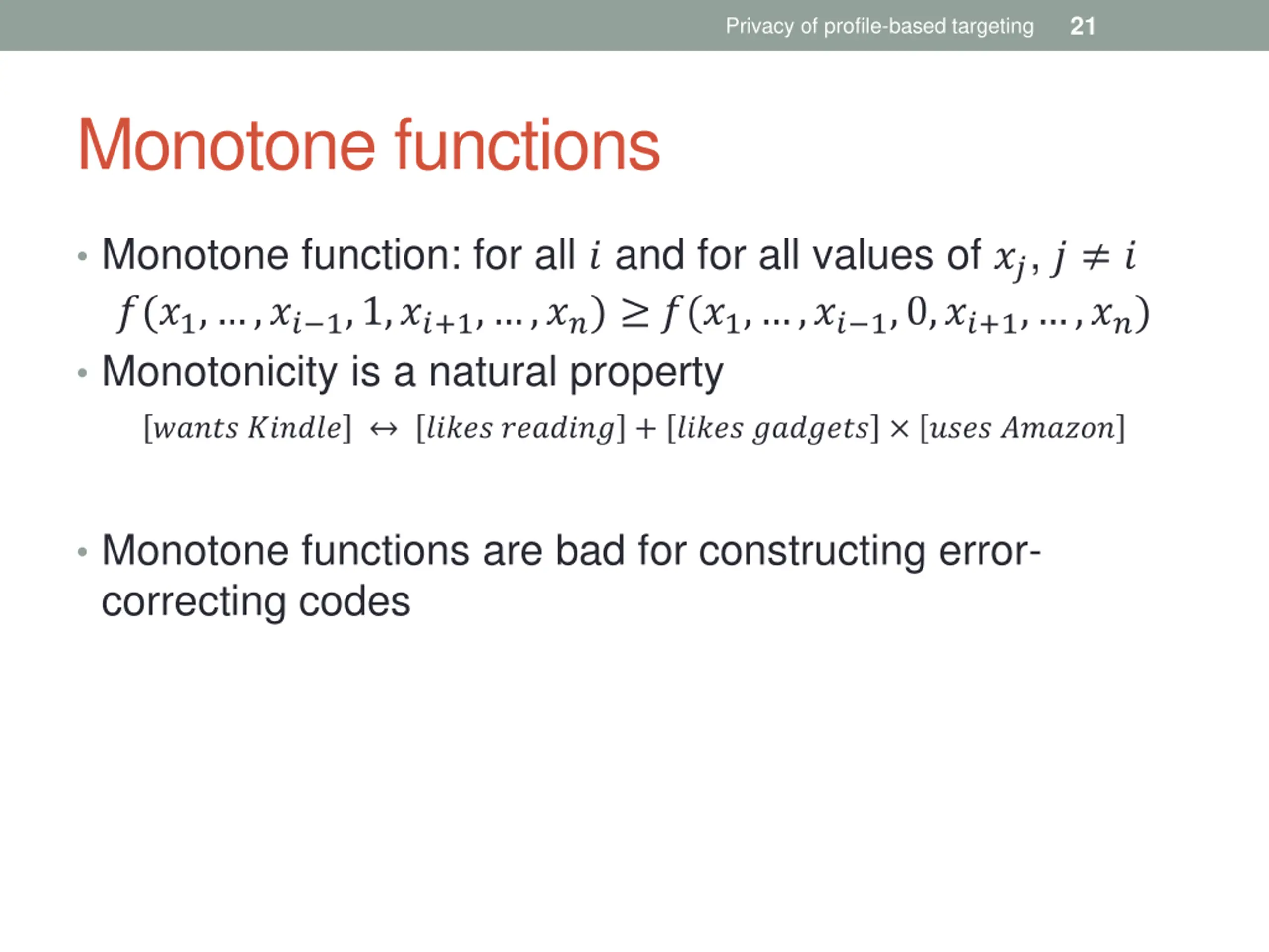 21 Privacy of profile-based targeting Monotone functions Monotone function: for all ? and for all values of ??, ? ? ?(?1, ,?? 1,1,??+1, ,??) ?(?1, ,?? 1,0,??+1, ,??) Monotonicity is a natural property ????? ?????? ????? ??????? + ????? ??????? ???? ?????? Monotone functions are bad for constructing error- correcting codes