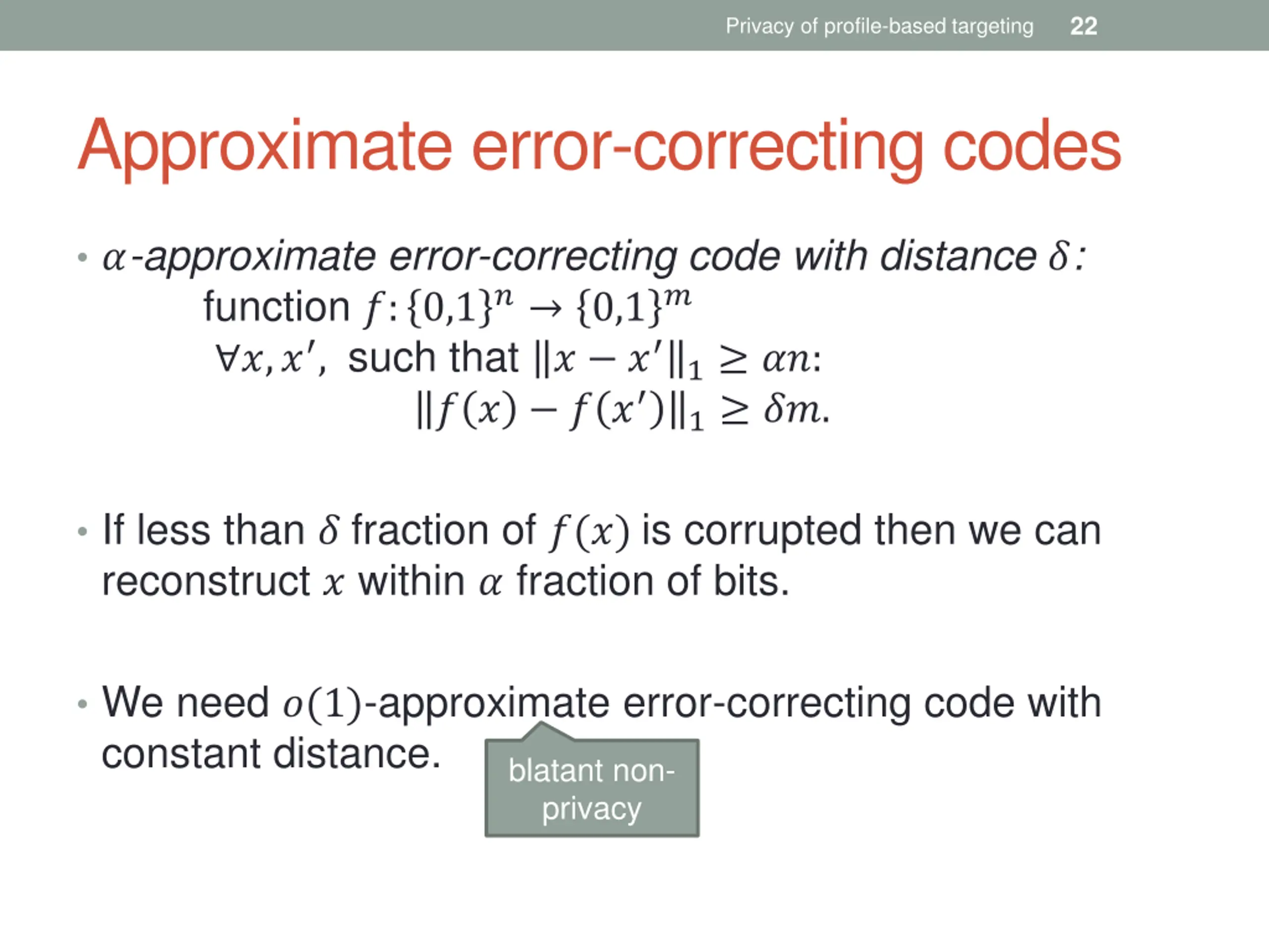 19 Privacy of profile-based targeting Error-correcting codes Constant relative distance Unique decoding Explicit, efficient