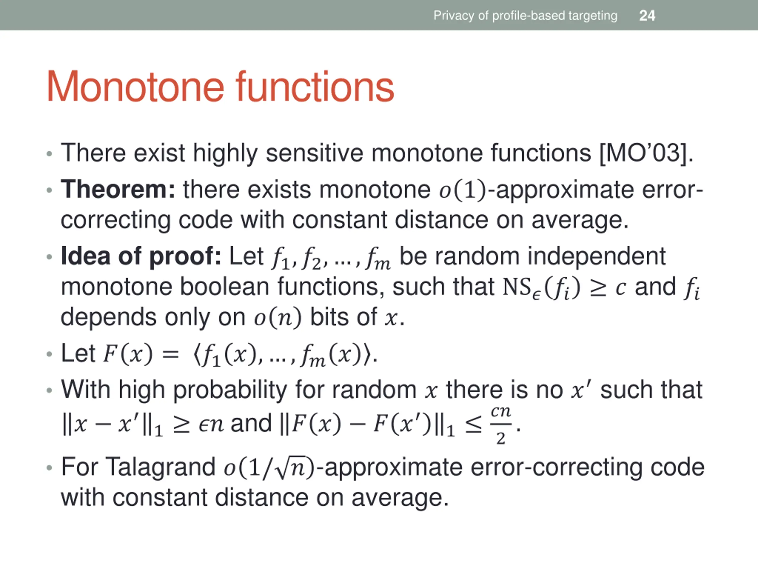 24 Privacy of profile-based targeting Monotone functions There exist highly sensitive monotone functions [MO 03]. Theorem: there exists monotone ? 1 -approximate error- correcting code with constant distance on average. Idea of proof: Let ?1,?2, ,?? be random independent monotone boolean functions, such that NS??? ? and ?? depends only on ? ? bits of ?. Let ? ? = ?1? , ,??? . With high probability for random ? there is no ? such that ? ? 1 ?? 1 ?? and ? ? ? ? For Talagrand ? 1/ ? -approximate error-correcting code with constant distance on average. 2.