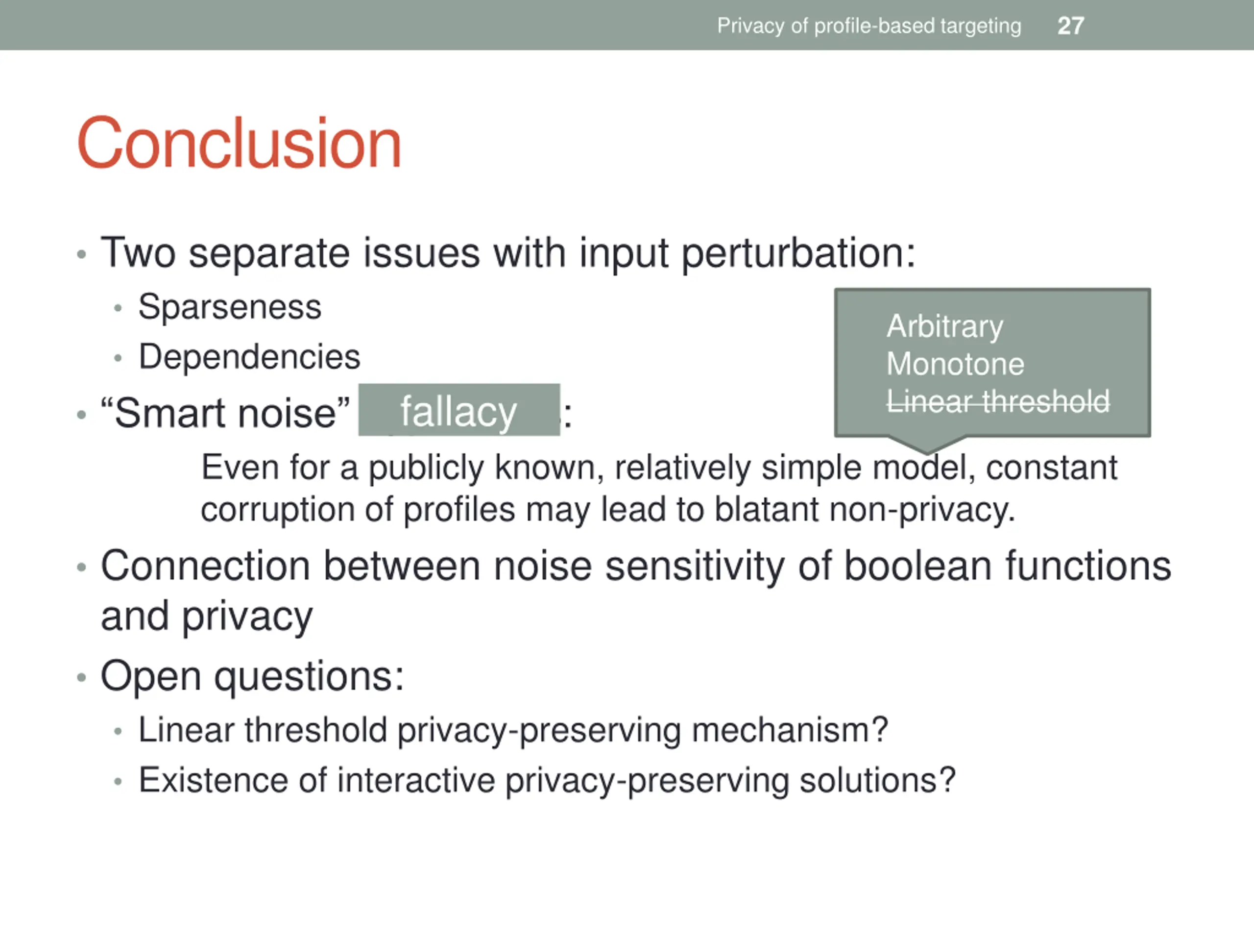 27 Privacy of profile-based targeting Conclusion Two separate issues with input perturbation: Sparseness Dependencies Smart noise hypothesis: Even for a publicly known, relatively simple model, constant corruption of profiles may lead to blatant non-privacy. Connection between noise sensitivity of boolean functions and privacy Open questions: Linear threshold privacy-preserving mechanism? Existence of interactive privacy-preserving solutions? Arbitrary Monotone Linear threshold fallacy