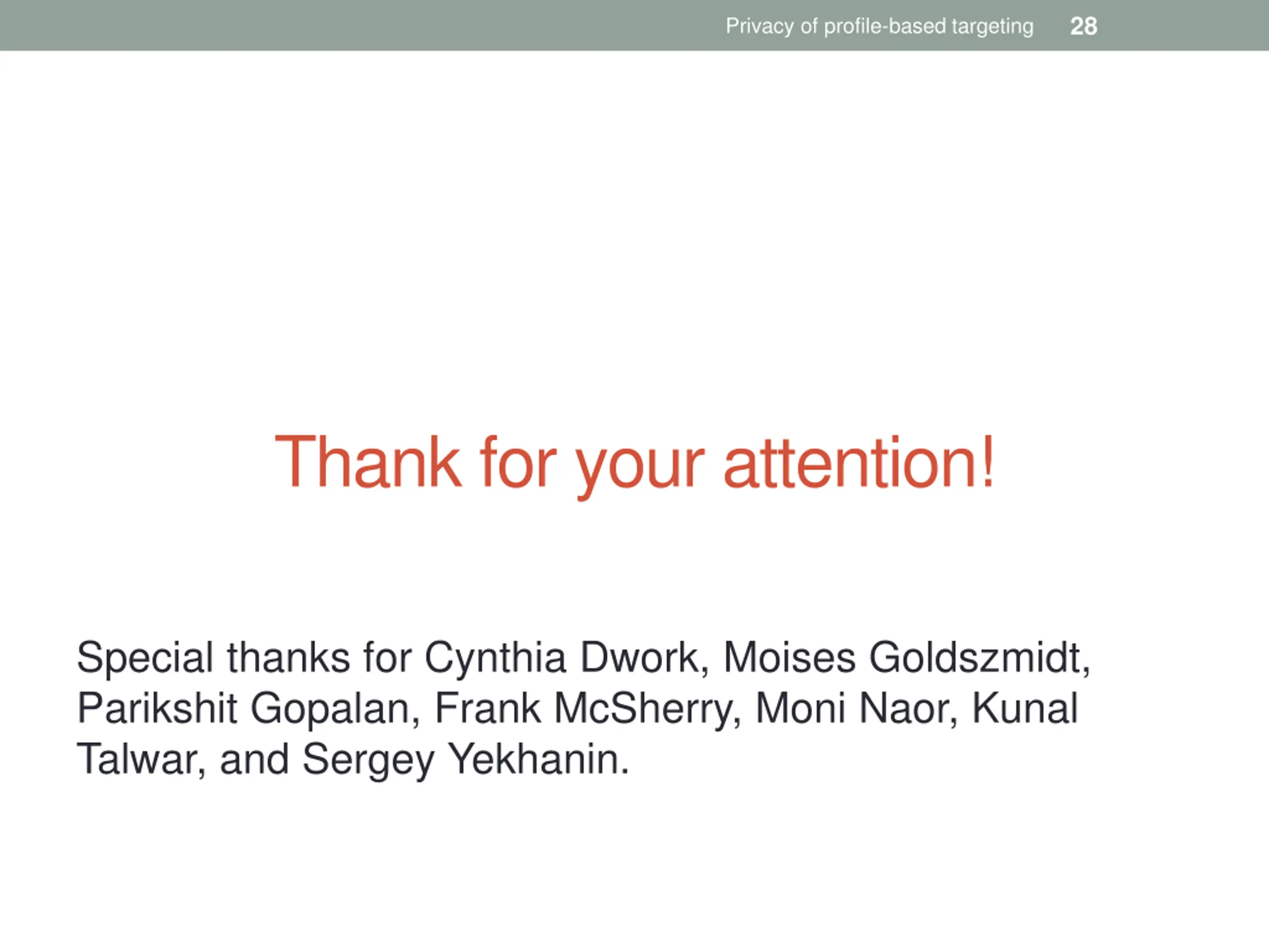 28 Privacy of profile-based targeting Thank for your attention! Special thanks for Cynthia Dwork, Moises Goldszmidt, Parikshit Gopalan, Frank McSherry, Moni Naor, Kunal Talwar, and Sergey Yekhanin.
