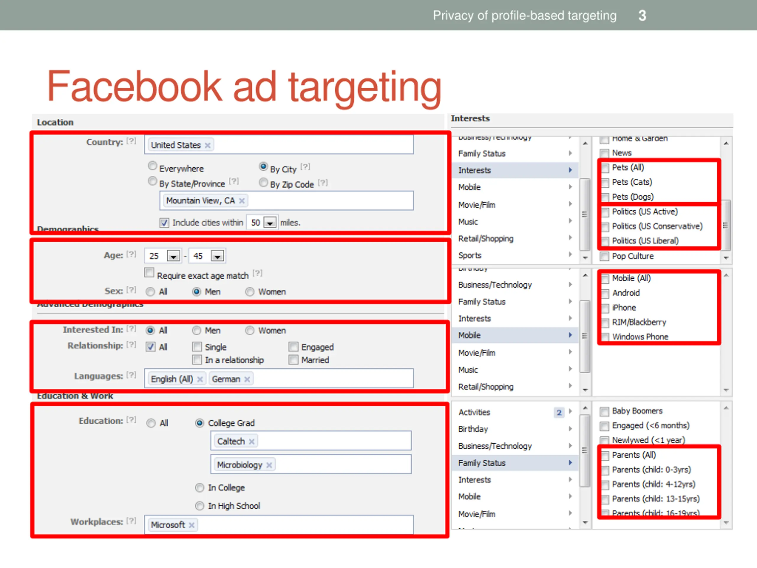 2 Privacy of profile-based targeting User-profile targeting Goal: increase impact of your ads by targeting a group potentially interested in your product. Examples: Social Network Profile = user s personal information + friends Search Engine Profile = search queries + webpages visited by user