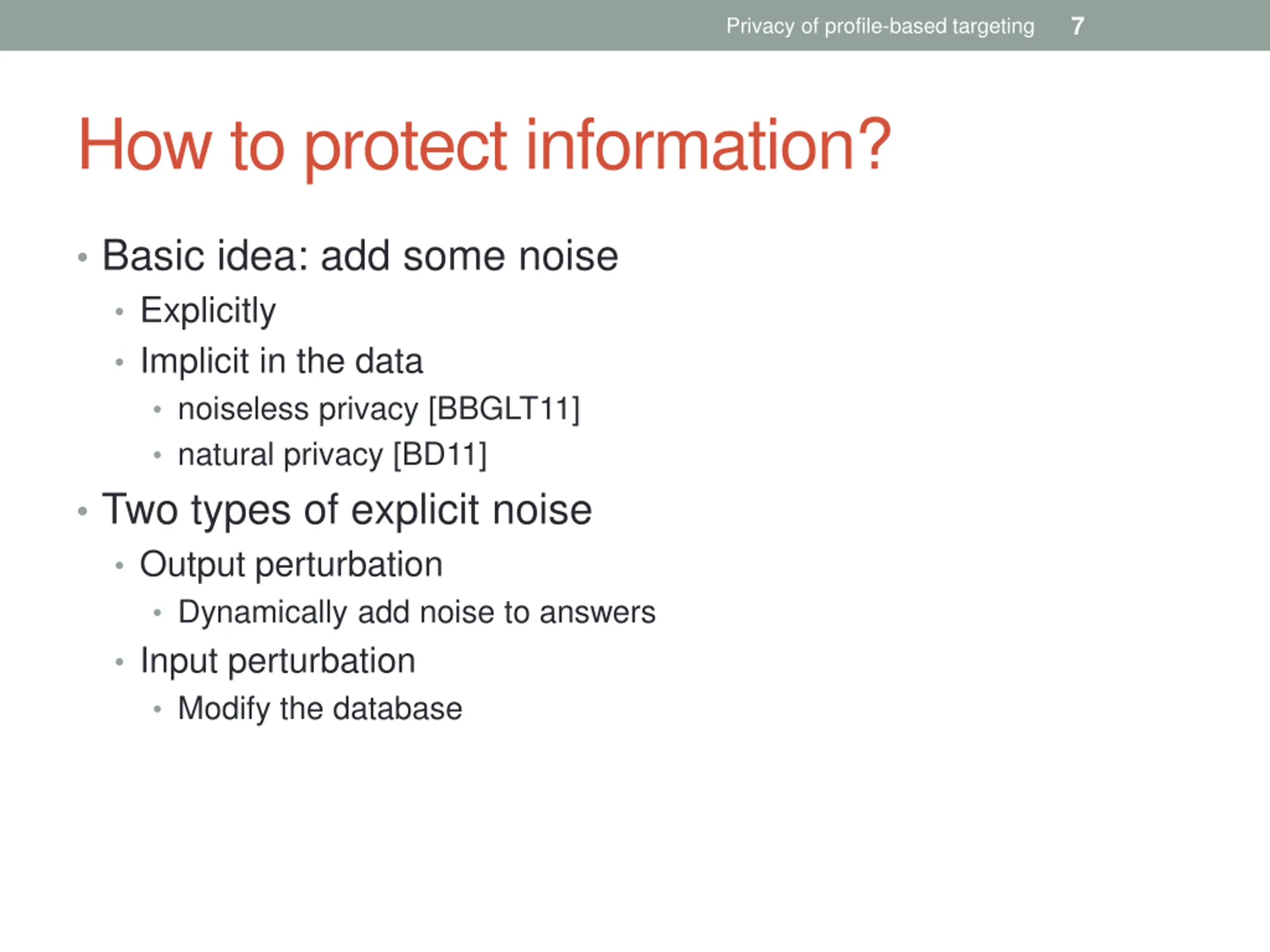 7 Privacy of profile-based targeting How to protect information? Basic idea: add some noise Explicitly Implicit in the data noiseless privacy [BBGLT11] natural privacy [BD11] Two types of explicit noise Output perturbation Dynamically add noise to answers Input perturbation Modify the database