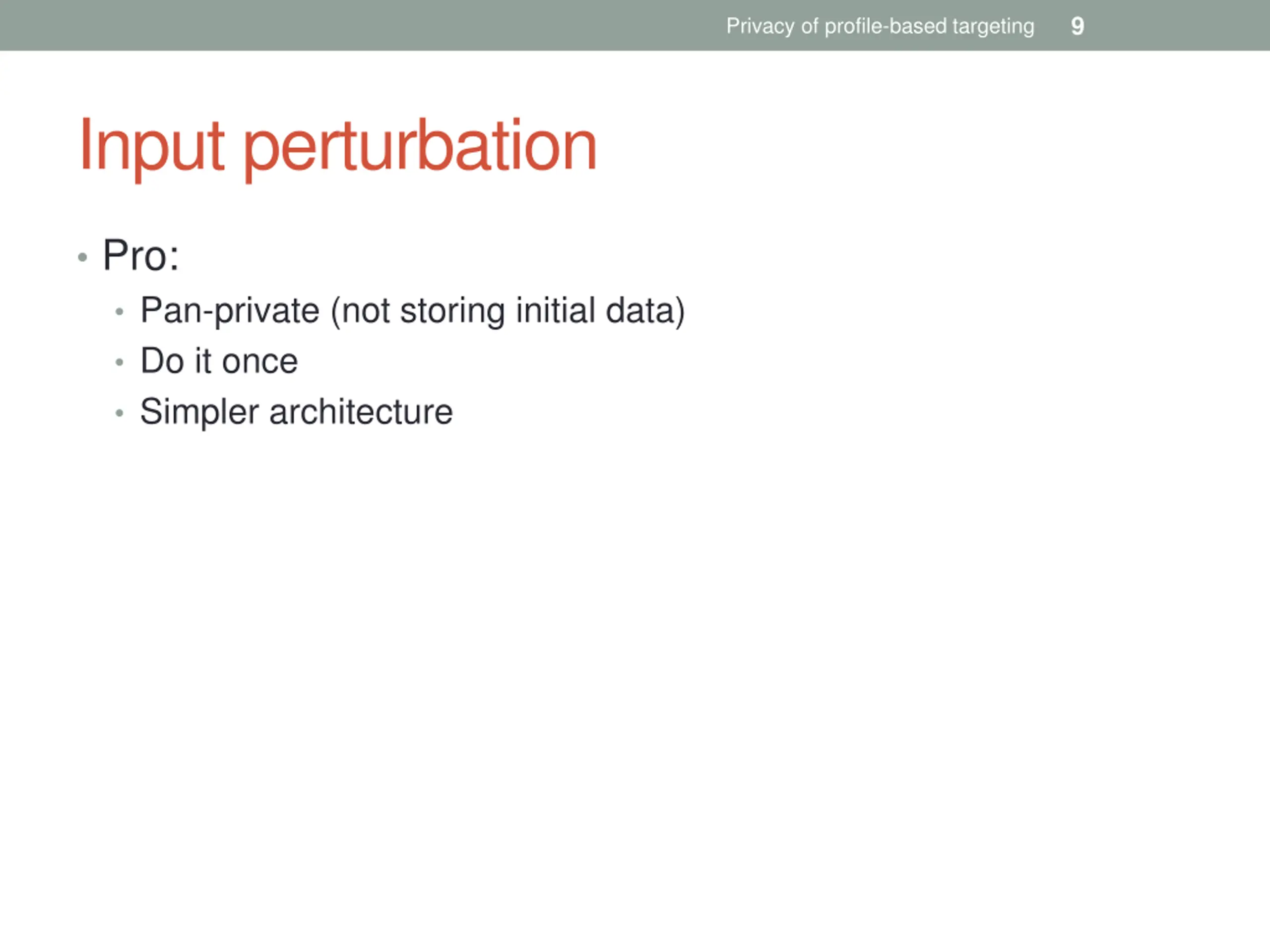 9 Privacy of profile-based targeting Input perturbation Pro: Pan-private (not storing initial data) Do it once Simpler architecture