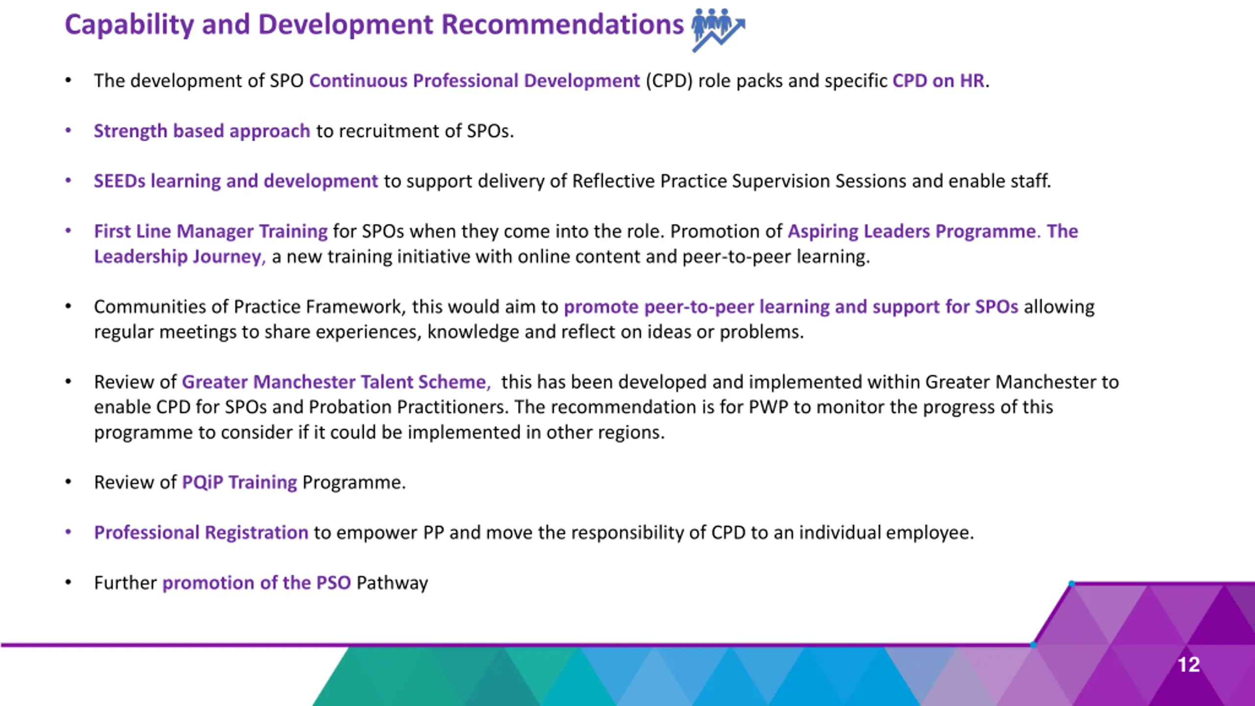 Capability and Development Recommendations The development of SPO Continuous Professional Development (CPD) role packs and specific CPD on HR. Strength based approach to recruitment of SPOs. SEEDs learning and development to support delivery of Reflective Practice Supervision Sessions and enable staff. First Line Manager Training for SPOs when they come into the role. Promotion of Aspiring Leaders Programme. The Leadership Journey, a new training initiative with online content and peer-to-peer learning. Communities of Practice Framework, this would aim to promote peer-to-peer learning and support for SPOs allowing regular meetings to share experiences, knowledge and reflect on ideas or problems. Review of Greater Manchester Talent Scheme, this has been developed and implemented within Greater Manchester to enable CPD for SPOs and Probation Practitioners. The recommendation is for PWP to monitor the progress of this programme to consider if it could be implemented in other regions. Review of PQiP Training Programme. Professional Registration to empower PP and move the responsibility of CPD to an individual employee. Further promotion of the PSO Pathway 12