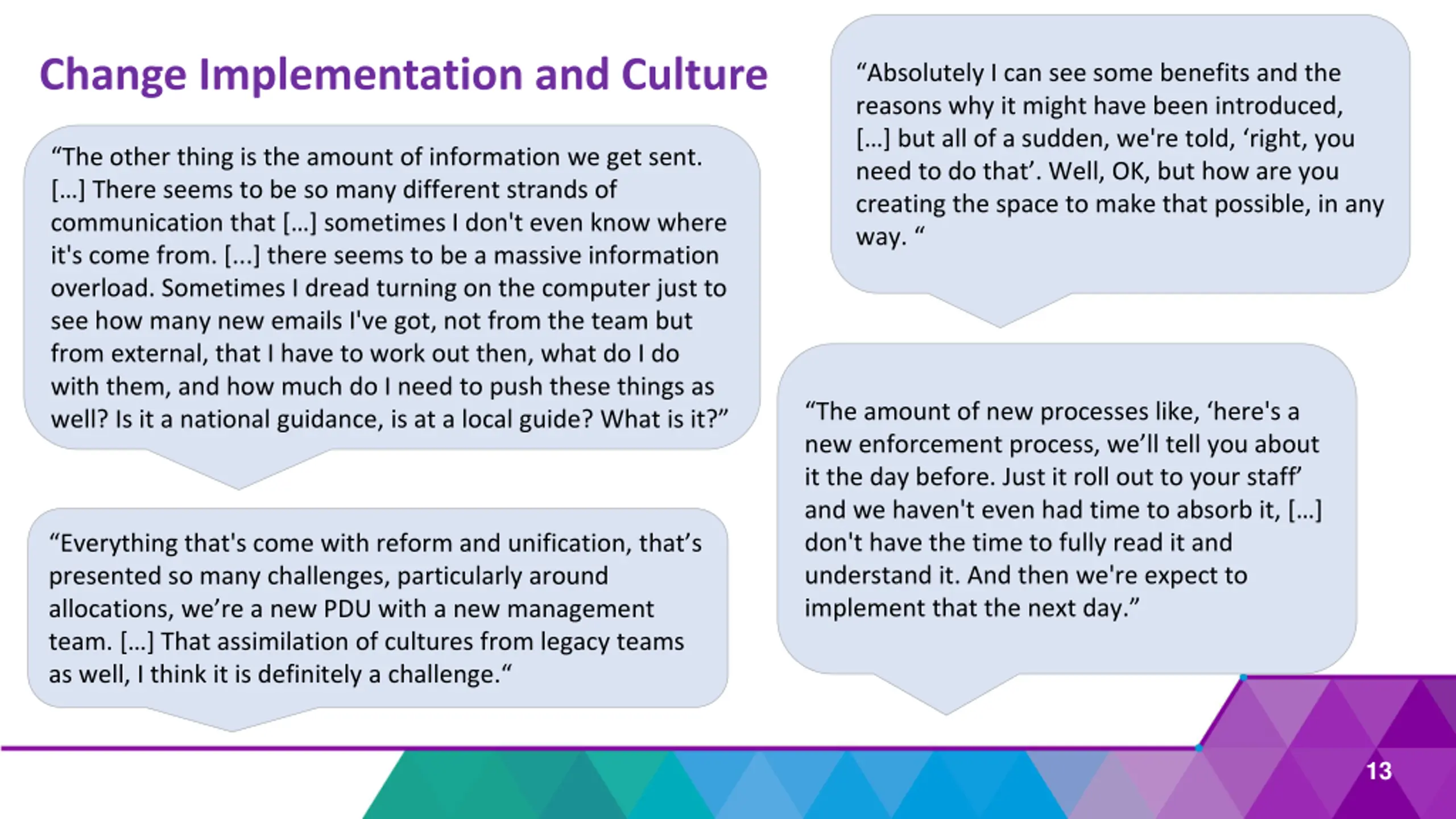 Change Implementation and Culture Absolutely I can see some benefits and the reasons why it might have been introduced, [ ] but all of a sudden, we're told, right, you need to do that . Well, OK, but how are you creating the space to make that possible, in any way. The other thing is the amount of information we get sent. [ ] There seems to be so many different strands of communication that [ ] sometimes I don't even know where it's come from. [...] there seems to be a massive information overload. Sometimes I dread turning on the computer just to see how many new emails I've got, not from the team but from external, that I have to work out then, what do I do with them, and how much do I need to push these things as well? Is it a national guidance, is at a local guide? What is it? The amount of new processes like, here's a new enforcement process, we ll tell you about it the day before. Just it roll out to your staff and we haven't even had time to absorb it, [ ] don't have the time to fully read it and understand it. And then we're expect to implement that the next day. Everything that's come with reform and unification, that s presented so many challenges, particularly around allocations, we re a new PDU with a new management team. [ ] That assimilation of cultures from legacy teams as well, I think it is definitely a challenge. 13