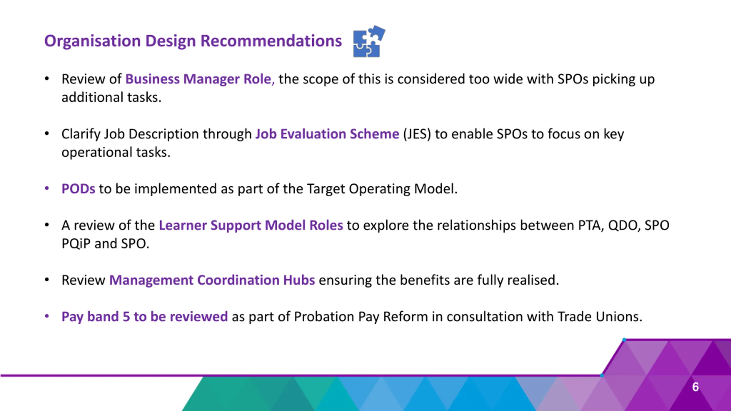 Organisation Design Recommendations Review of Business Manager Role, the scope of this is considered too wide with SPOs picking up additional tasks. Clarify Job Description through Job Evaluation Scheme (JES) to enable SPOs to focus on key operational tasks. PODs to be implemented as part of the Target Operating Model. A review of the Learner Support Model Roles to explore the relationships between PTA, QDO, SPO PQiP and SPO. Review Management Coordination Hubs ensuring the benefits are fully realised. Pay band 5 to be reviewed as part of Probation Pay Reform in consultation with Trade Unions. 6