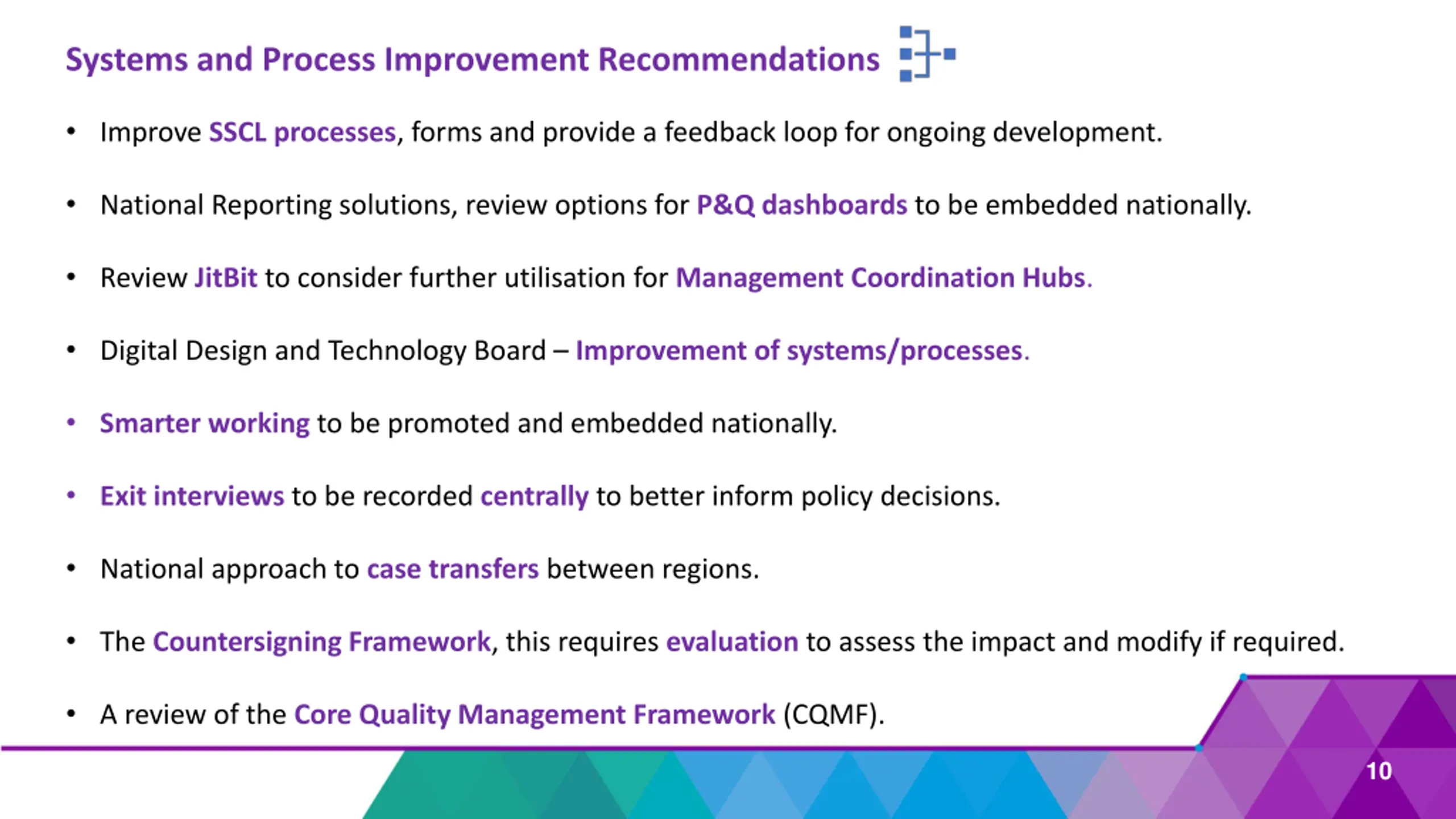 Systems and Process Improvement Recommendations Improve SSCL processes, forms and provide a feedback loop for ongoing development. National Reporting solutions, review options for P&Q dashboards to be embedded nationally. Review JitBit to consider further utilisation for Management Coordination Hubs. Digital Design and Technology Board Improvement of systems/processes. Smarter working to be promoted and embedded nationally. Exit interviews to be recorded centrally to better inform policy decisions. National approach to case transfers between regions. The Countersigning Framework, this requires evaluation to assess the impact and modify if required. A review of the Core Quality Management Framework (CQMF). 10