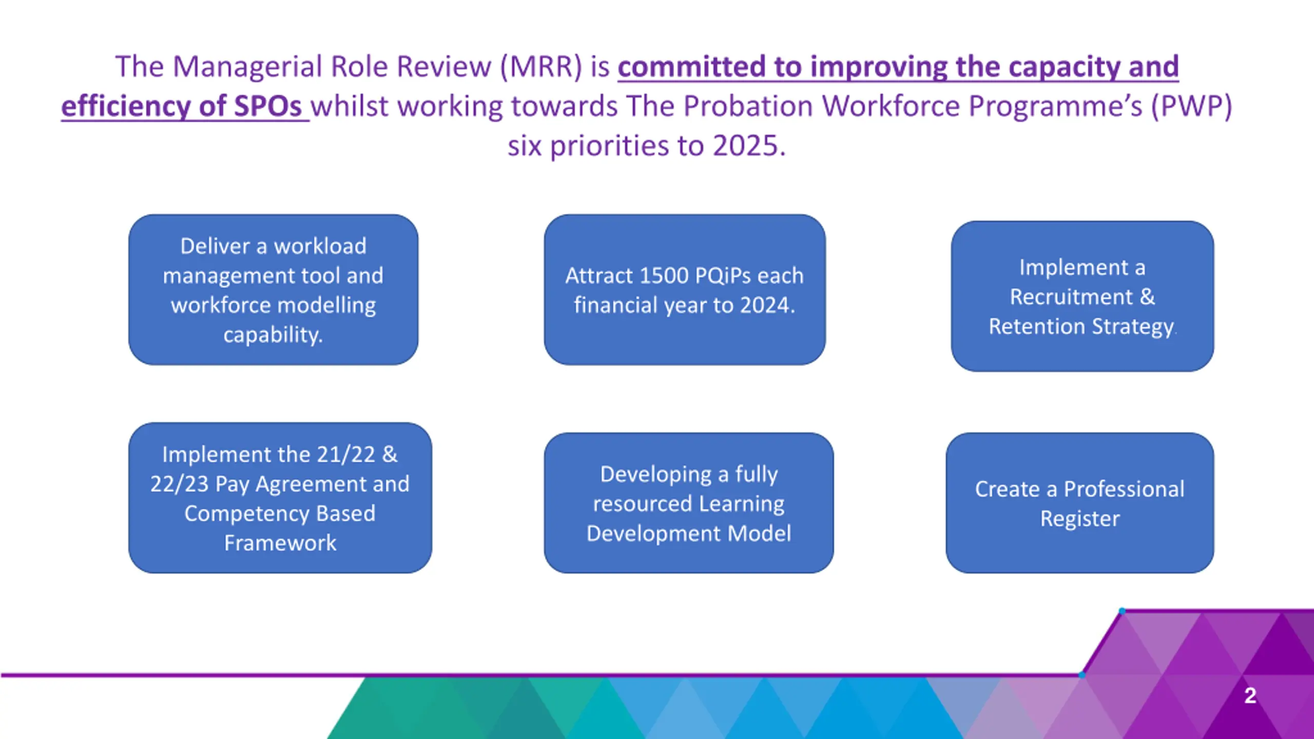 The Managerial Role Review (MRR) is committed to improving the capacity and efficiency of SPOs whilst working towards The Probation Workforce Programme s (PWP) six priorities to 2025. Deliver a workload management tool and workforce modelling capability. Implement a Recruitment & Retention Strategy. Attract 1500 PQiPs each financial year to 2024. Implement the 21/22 & 22/23 Pay Agreement and Competency Based Framework Developing a fully resourced Learning Development Model Create a Professional Register 2