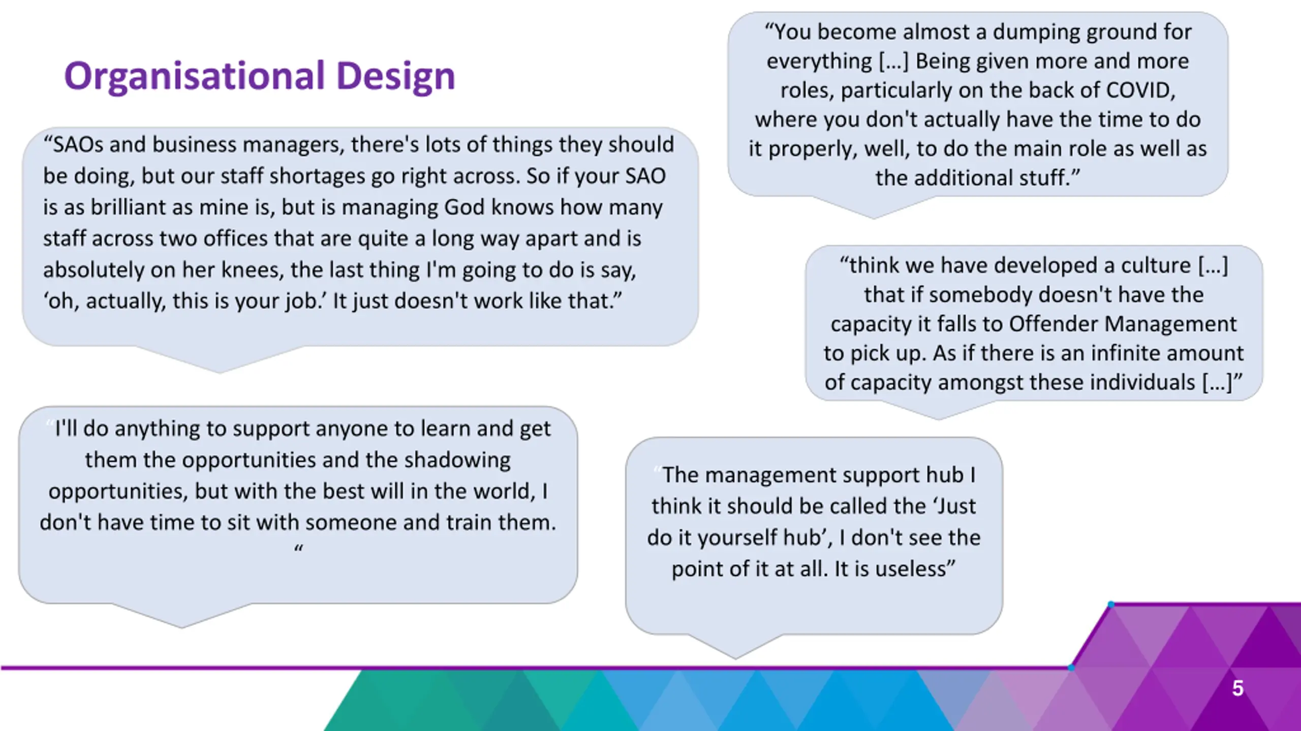 You become almost a dumping ground for everything [ ] Being given more and more roles, particularly on the back of COVID, where you don't actually have the time to do it properly, well, to do the main role as well as the additional stuff. Organisational Design SAOs and business managers, there's lots of things they should be doing, but our staff shortages go right across. So if your SAO is as brilliant as mine is, but is managing God knows how many staff across two offices that are quite a long way apart and is absolutely on her knees, the last thing I'm going to do is say, oh, actually, this is your job. It just doesn't work like that. think we have developed a culture [ ] that if somebody doesn't have the capacity it falls to Offender Management to pick up. As if there is an infinite amount of capacity amongst these individuals [ ] I'll do anything to support anyone to learn and get them the opportunities and the shadowing opportunities, but with the best will in the world, I don't have time to sit with someone and train them. The management support hub I think it should be called the Just do it yourself hub , I don't see the point of it at all. It is useless 5