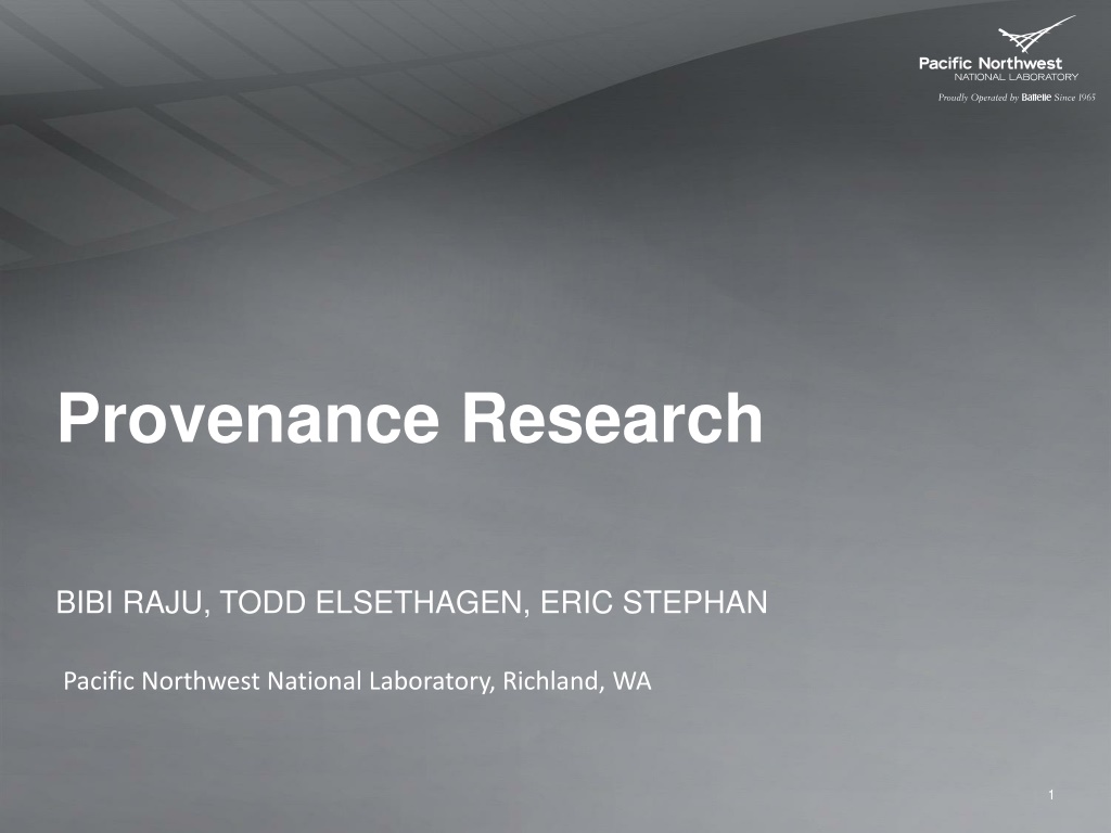 Provenance Research BIBI RAJU, TODD ELSETHAGEN, ERIC STEPHAN Pacific Northwest National Laboratory, Richland, WA 1