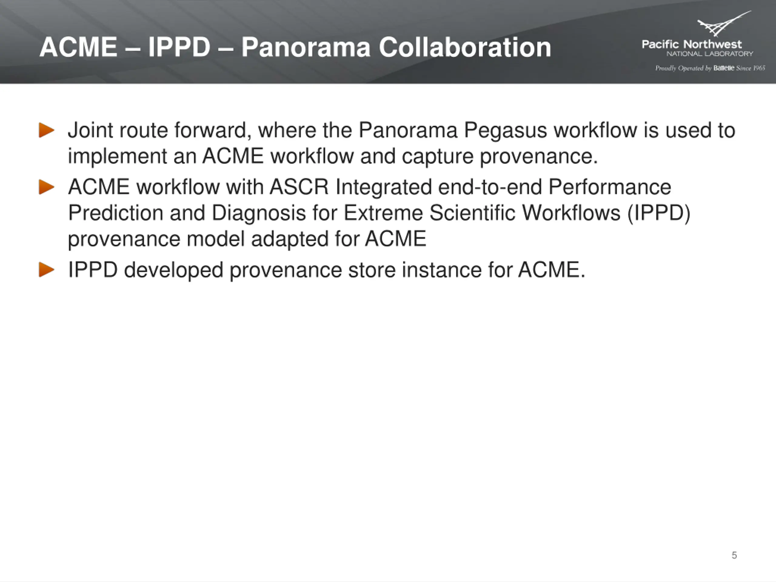 ACME IPPD Panorama Collaboration Joint route forward, where the Panorama Pegasus workflow is used to implement an ACME workflow and capture provenance. ACME workflow with ASCR Integrated end-to-end Performance Prediction and Diagnosis for Extreme Scientific Workflows (IPPD) provenance model adapted for ACME IPPD developed provenance store instance for ACME. 5