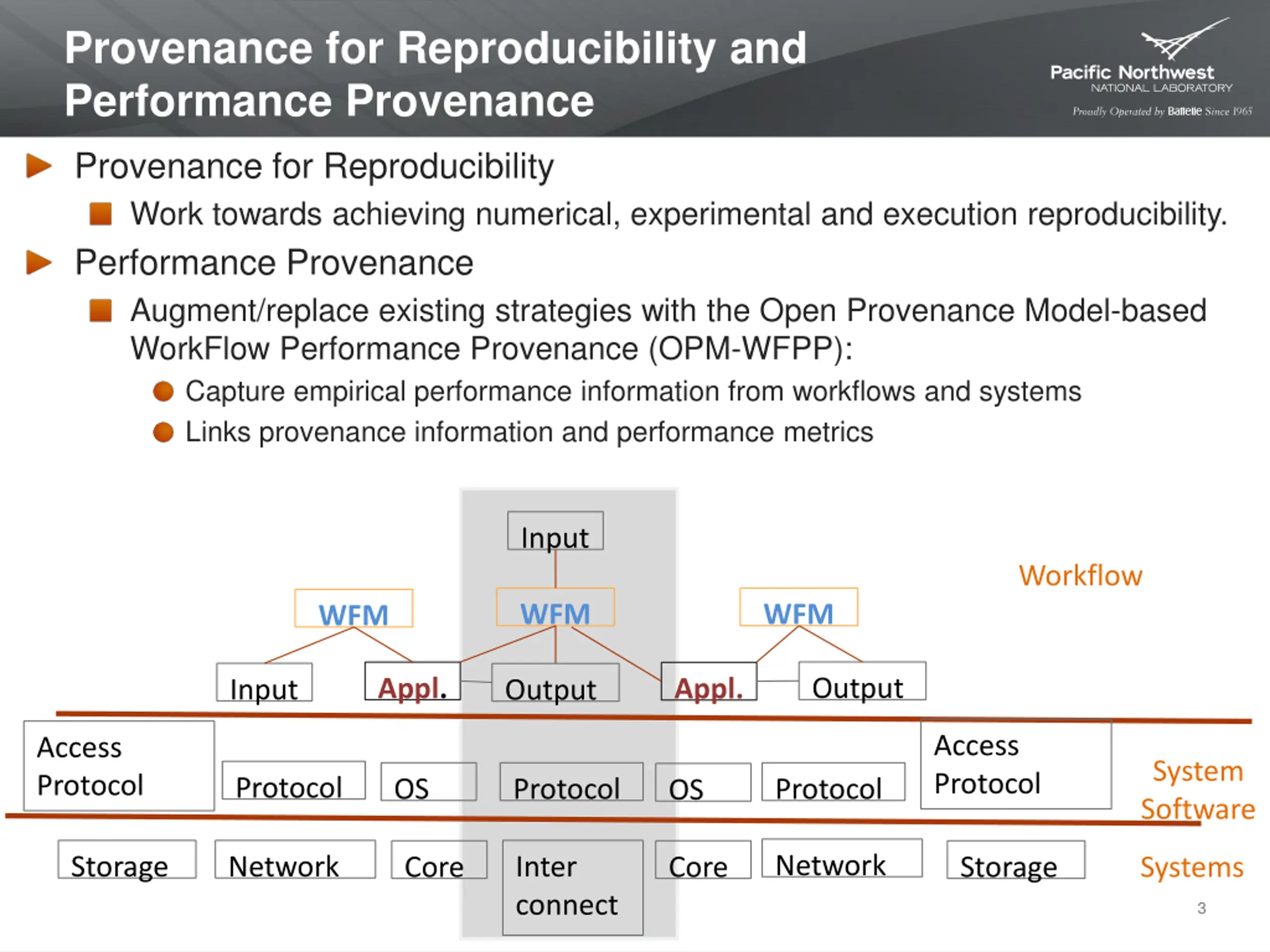 Provenance for Reproducibility and Performance Provenance Provenance for Reproducibility Work towards achieving numerical, experimental and execution reproducibility. Performance Provenance Augment/replace existing strategies with the Open Provenance Model-based WorkFlow Performance Provenance (OPM-WFPP): Capture empirical performance information from workflows and systems Links provenance information and performance metrics Input Workflow WFM WFM WFM Output Appl. Appl. Input Output Access Protocol Access Protocol System Software Protocol OS Protocol Protocol OS Network Storage Network Inter connect Core Core Storage Systems 3