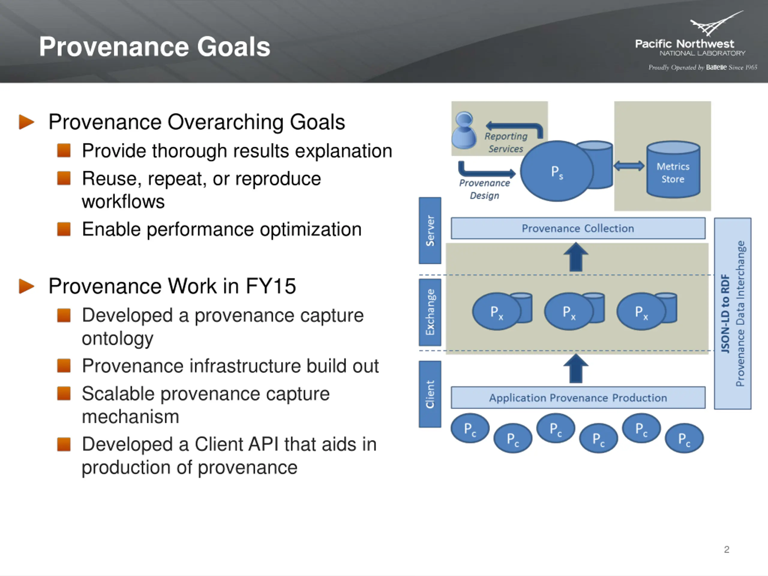 Provenance Goals Provenance Overarching Goals Provide thorough results explanation Reuse, repeat, or reproduce workflows Enable performance optimization Provenance Work in FY15 Developed a provenance capture ontology Provenance infrastructure build out Scalable provenance capture mechanism Developed a Client API that aids in production of provenance 2