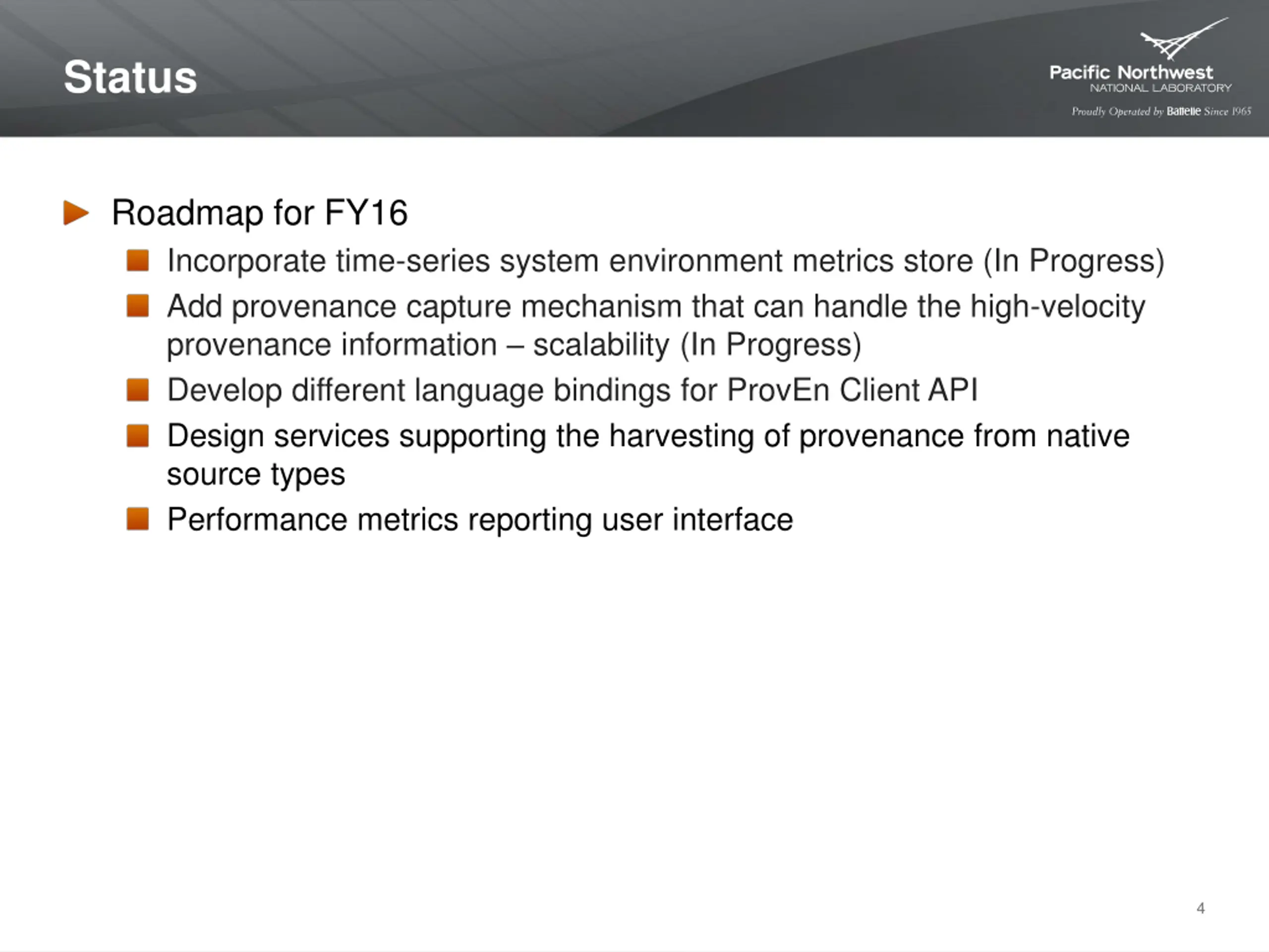 Status Roadmap for FY16 Incorporate time-series system environment metrics store (In Progress) Add provenance capture mechanism that can handle the high-velocity provenance information scalability (In Progress) Develop different language bindings for ProvEn Client API Design services supporting the harvesting of provenance from native source types Performance metrics reporting user interface 4