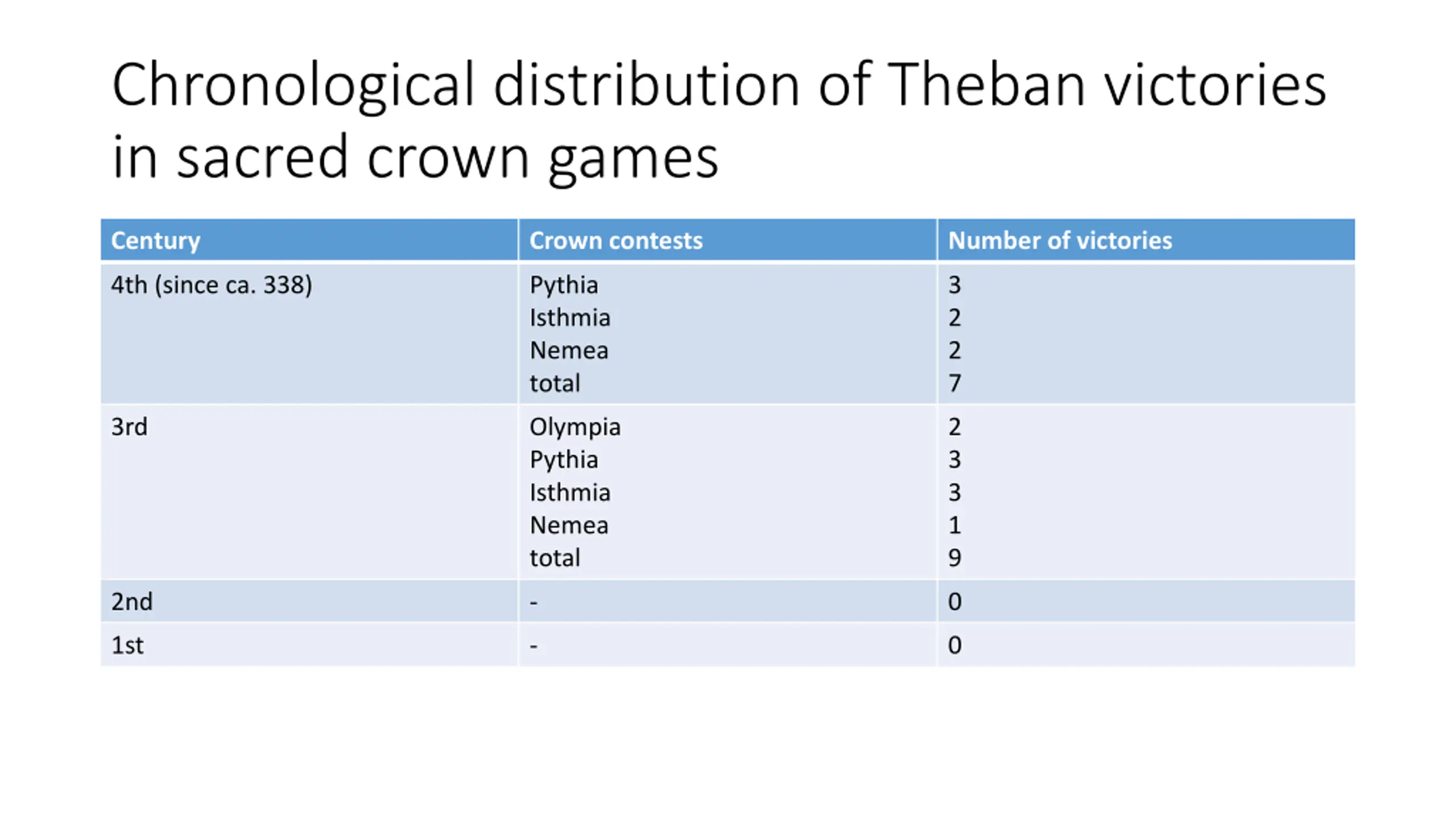 Chronological distribution of Theban victories in sacred crown games Century Crown contests Number of victories 4th (since ca. 338) Pythia Isthmia Nemea total 3 2 2 7 3rd Olympia Pythia Isthmia Nemea total 2 3 3 1 9 2nd - 0 1st - 0
