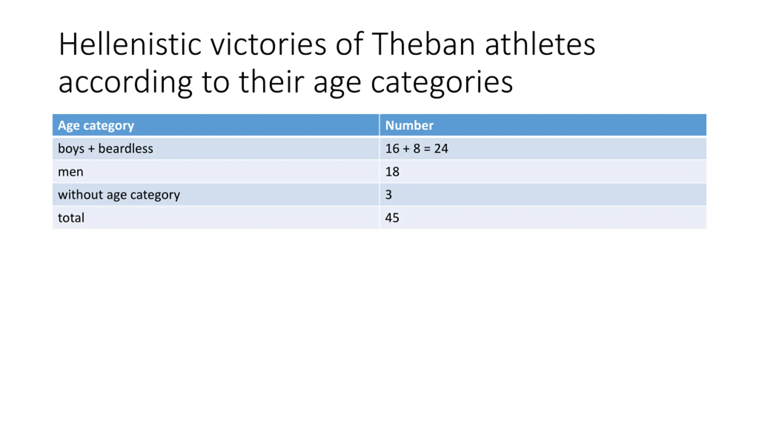 Hellenistic victories of Theban athletes according to their age categories Age category Number boys + beardless 16 + 8 = 24 men 18 without age category 3 total 45