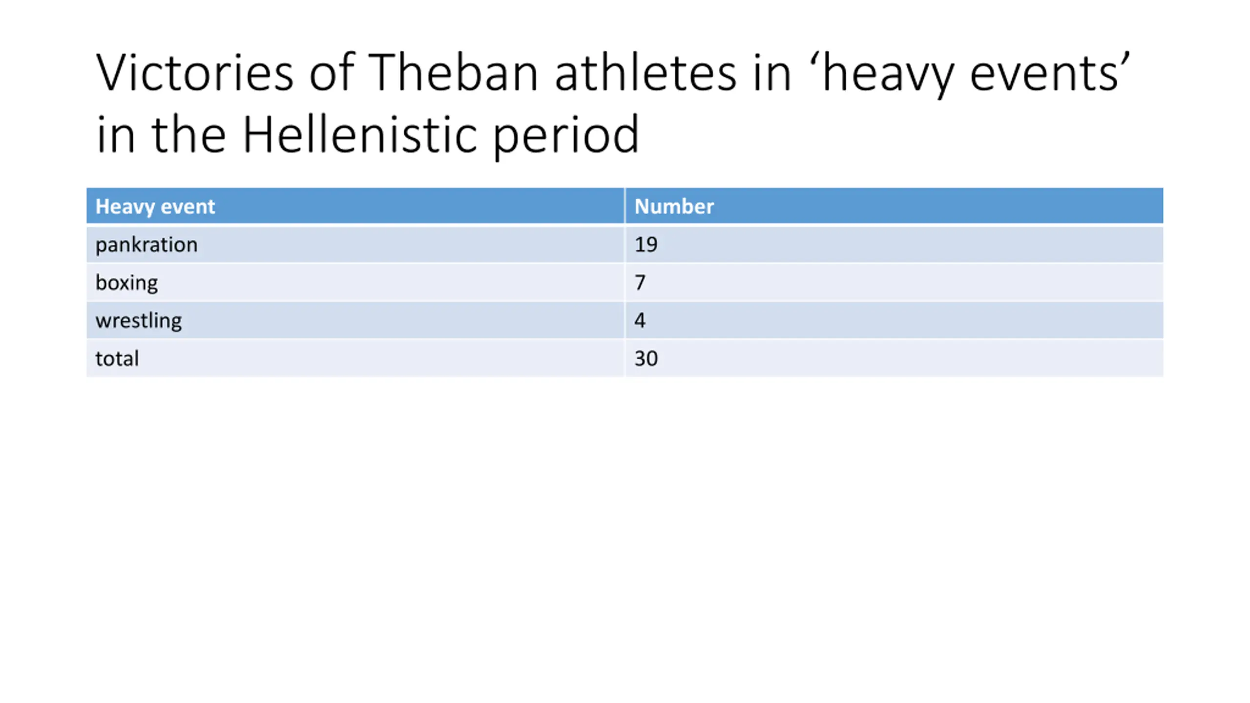 Victories of Theban athletes in heavy events in the Hellenistic period Heavy event Number pankration 19 boxing 7 wrestling 4 total 30