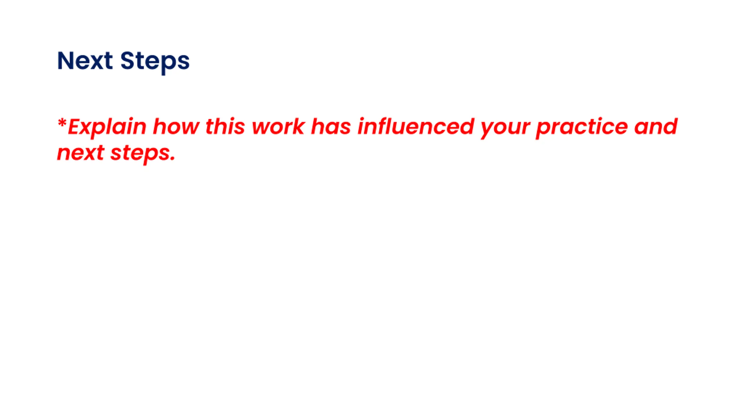 Next Steps *Explain how this work has influenced your practice and next steps.