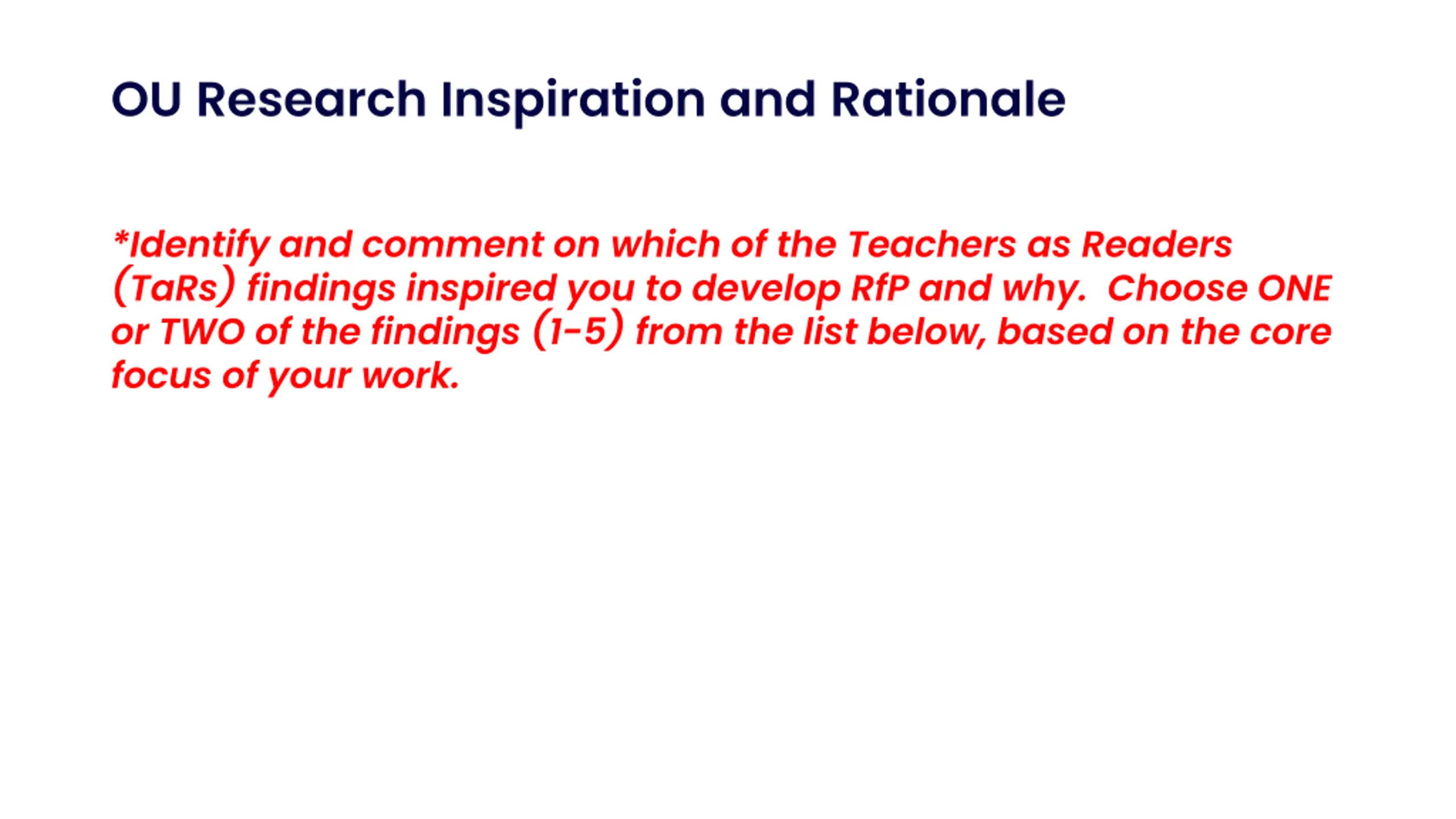 OU Research Inspiration and Rationale *Identify and comment on which of the Teachers as Readers (TaRs) findings inspired you to develop RfP and why. Choose ONE or TWO of the findings (1-5) from the list below, based on the core focus of your work.
