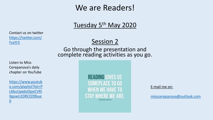We are Readers! Tuesday 5thMay 2020 Contact us on twitter https://twitter.com/ FvaYr5 Session 2 Go through the presentation and complete reading activities as you go. Listen to Miss Cerepanova s daily chapter on YouTube https://www.youtub e.com/playlist?list=P L6buUpxdolSpeCVRI XgywU2DRCED9bue 0 E-mail me on: misscerepanova@outlook.com