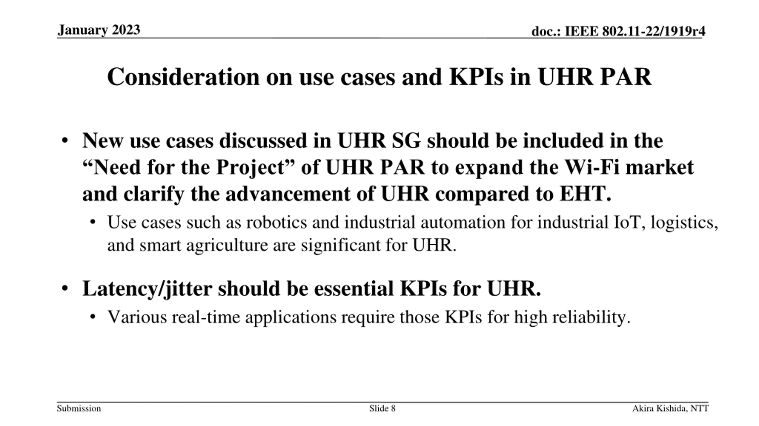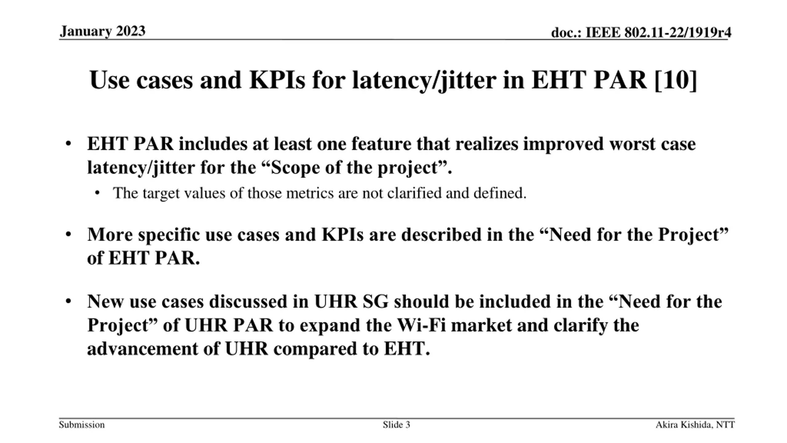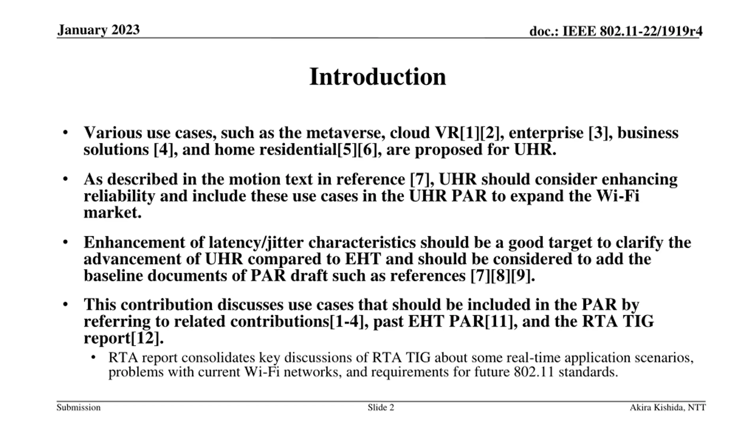 January 2023 doc.: IEEE 802.11-22/1919r4 Introduction Various use cases, such as the metaverse, cloud VR[1][2], enterprise [3], business solutions [4], and home residential[5][6], are proposed for UHR. As described in the motion text in reference [7], UHR should consider enhancing reliability and include these use cases in the UHR PAR to expand the Wi-Fi market. Enhancement of latency/jitter characteristics should be a good target to clarify the advancement of UHR compared to EHT and should be considered to add the baseline documents of PAR draft such as references [7][8][9]. This contribution discusses use cases that should be included in the PAR by referring to related contributions[1-4], past EHT PAR[11], and the RTA TIG report[12]. RTA report consolidates key discussions of RTA TIG about some real-time application scenarios, problems with current Wi-Fi networks, and requirements for future 802.11 standards. Submission Slide 2 Akira Kishida, NTT