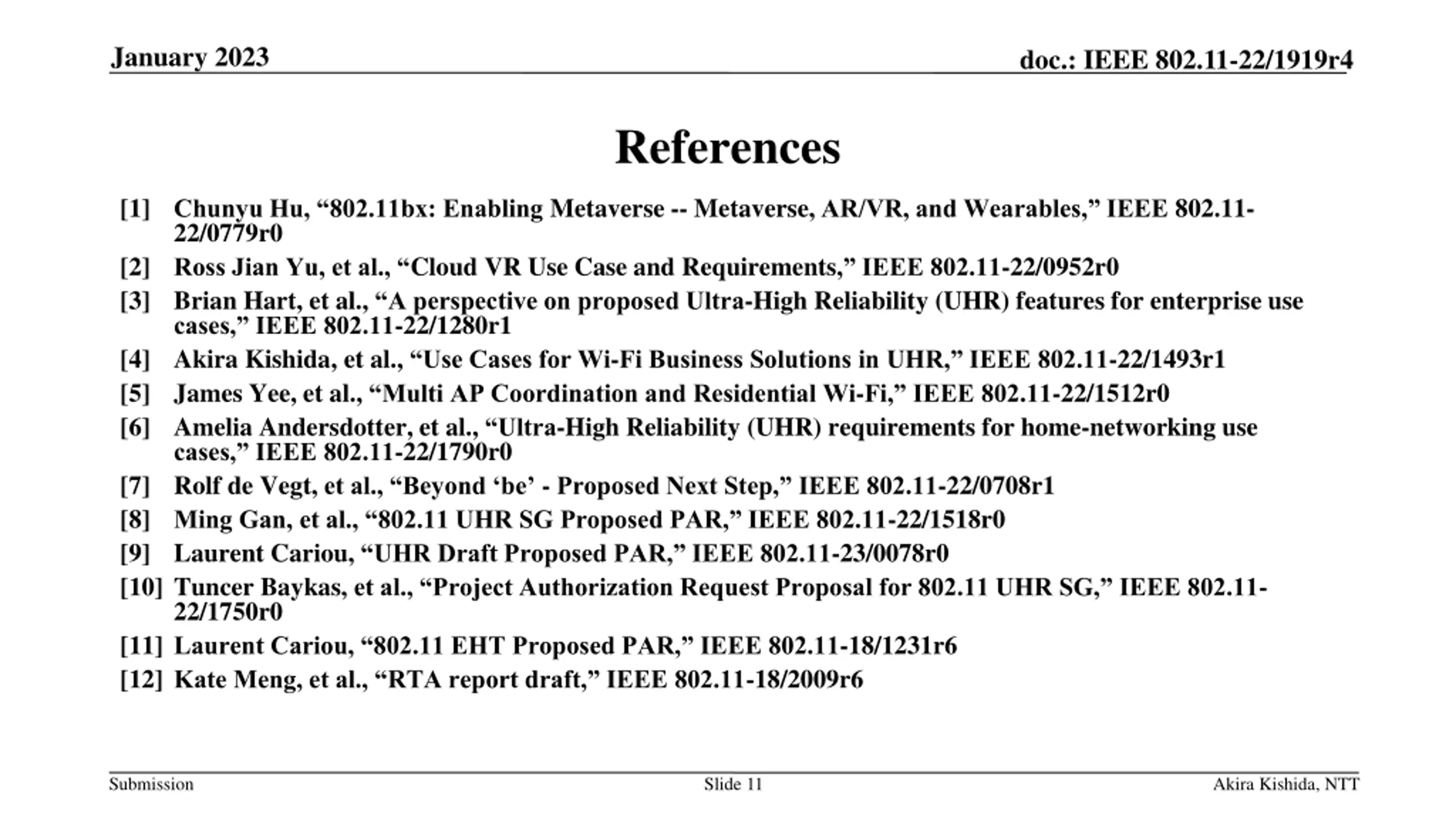 January 2023 doc.: IEEE 802.11-22/1919r4 References [1] Chunyu Hu, 802.11bx: Enabling Metaverse -- Metaverse, AR/VR, and Wearables, IEEE 802.11- 22/0779r0 [2] Ross Jian Yu, et al., Cloud VR Use Case and Requirements, IEEE 802.11-22/0952r0 [3] Brian Hart, et al., A perspective on proposed Ultra-High Reliability (UHR) features for enterprise use cases, IEEE 802.11-22/1280r1 [4] Akira Kishida, et al., Use Cases for Wi-Fi Business Solutions in UHR, IEEE 802.11-22/1493r1 [5] James Yee, et al., Multi AP Coordination and Residential Wi-Fi, IEEE 802.11-22/1512r0 [6] Amelia Andersdotter, et al., Ultra-High Reliability (UHR) requirements for home-networking use cases, IEEE 802.11-22/1790r0 [7] Rolf de Vegt, et al., Beyond be - Proposed Next Step, IEEE 802.11-22/0708r1 [8] Ming Gan, et al., 802.11 UHR SG Proposed PAR, IEEE 802.11-22/1518r0 [9] Laurent Cariou, UHR Draft Proposed PAR, IEEE 802.11-23/0078r0 [10] Tuncer Baykas, et al., Project Authorization Request Proposal for 802.11 UHR SG, IEEE 802.11- 22/1750r0 [11] Laurent Cariou, 802.11 EHT Proposed PAR, IEEE 802.11-18/1231r6 [12] Kate Meng, et al., RTA report draft, IEEE 802.11-18/2009r6 Submission Slide 11 Akira Kishida, NTT