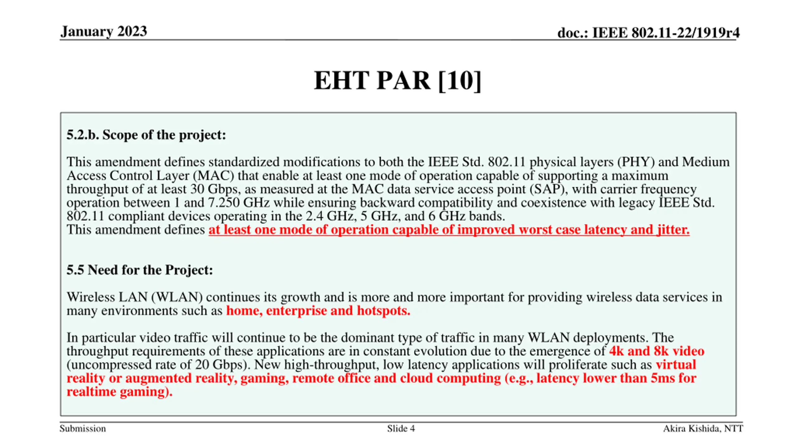 January 2023 doc.: IEEE 802.11-22/1919r4 EHT PAR [10] 5.2.b. Scope of the project: This amendment defines standardized modifications to both the IEEE Std. 802.11 physical layers (PHY) and Medium Access Control Layer (MAC) that enable at least one mode of operation capable of supporting a maximum throughput of at least 30 Gbps, as measured at the MAC data service access point (SAP), with carrier frequency operation between 1 and 7.250 GHz while ensuring backward compatibility and coexistence with legacy IEEE Std. 802.11 compliant devices operating in the 2.4 GHz, 5 GHz, and 6 GHz bands. This amendment defines at least one mode of operation capable of improved worst case latency and jitter. 5.5 Need for the Project: Wireless LAN (WLAN) continues its growth and is more and more important for providing wireless data services in many environments such as home, enterprise and hotspots. In particular video traffic will continue to be the dominant type of traffic in many WLAN deployments. The throughput requirements of these applications are in constant evolution due to the emergence of 4k and 8k video (uncompressed rate of 20 Gbps). New high-throughput, low latency applications will proliferate such as virtual reality or augmented reality, gaming, remote office and cloud computing (e.g., latency lower than 5ms for realtime gaming). Submission Slide 4 Akira Kishida, NTT