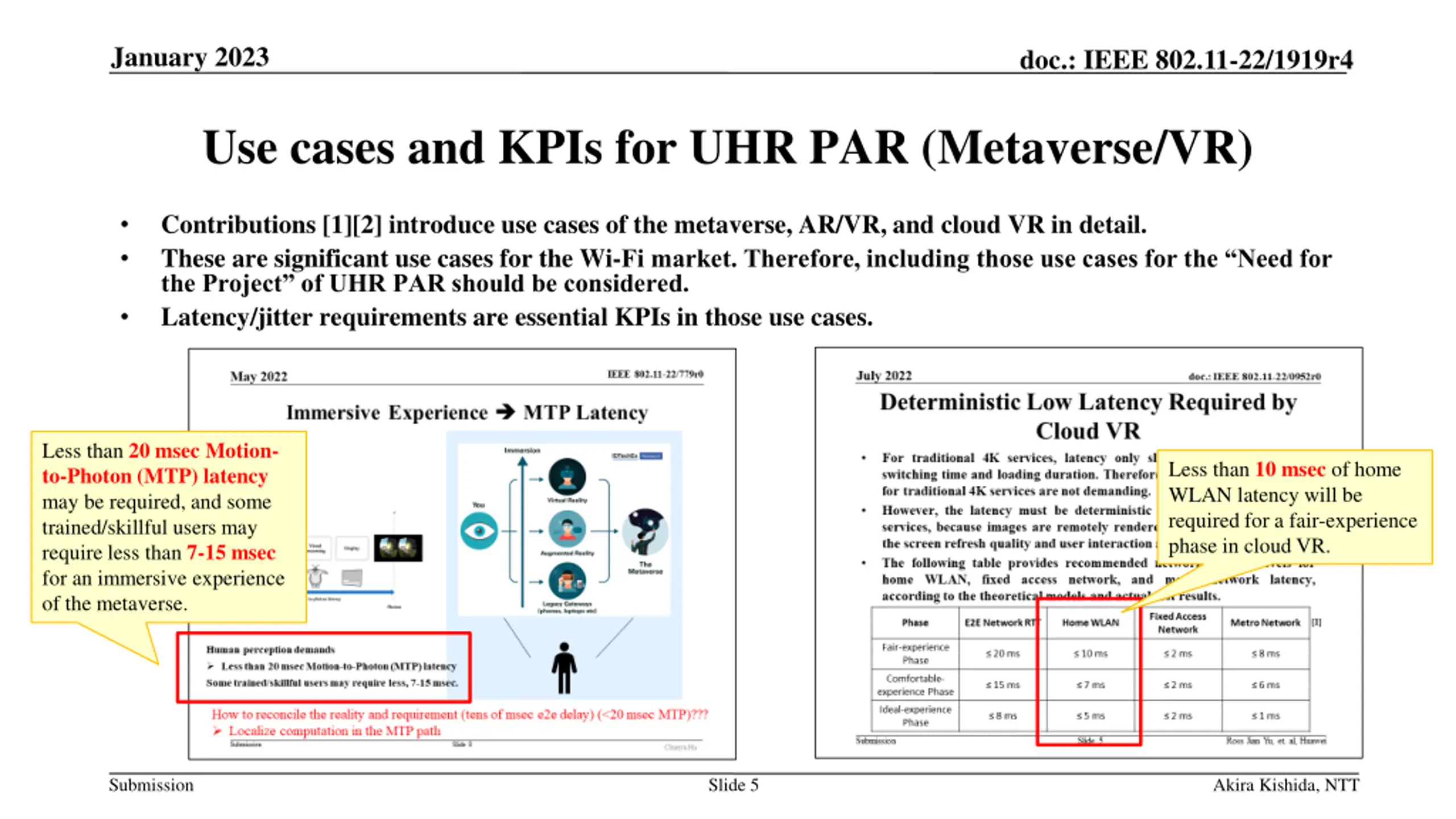 January 2023 doc.: IEEE 802.11-22/1919r4 Use cases and KPIs for UHR PAR (Metaverse/VR) Contributions [1][2] introduce use cases of the metaverse, AR/VR, and cloud VR in detail. These are significant use cases for the Wi-Fi market. Therefore, including those use cases for the Need for the Project of UHR PAR should be considered. Latency/jitter requirements are essential KPIs in those use cases. Less than 20 msec Motion- to-Photon (MTP) latency may be required, and some trained/skillful users may require less than 7-15 msec for an immersive experience of the metaverse. Less than 10 msec of home WLAN latency will be required for a fair-experience phase in cloud VR. Submission Slide 5 Akira Kishida, NTT