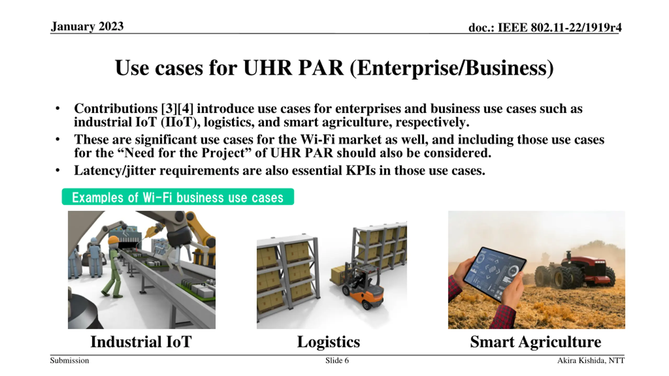 January 2023 doc.: IEEE 802.11-22/1919r4 Use cases for UHR PAR (Enterprise/Business) Contributions [3][4] introduce use cases for enterprises and business use cases such as industrial IoT (IIoT), logistics, and smart agriculture, respectively. These are significant use cases for the Wi-Fi market as well, and including those use cases for the Need for the Project of UHR PAR should also be considered. Latency/jitter requirements are also essential KPIs in those use cases. Examples of Wi-Fi business use cases Industrial IoT Logistics Smart Agriculture Submission Slide 6 Akira Kishida, NTT