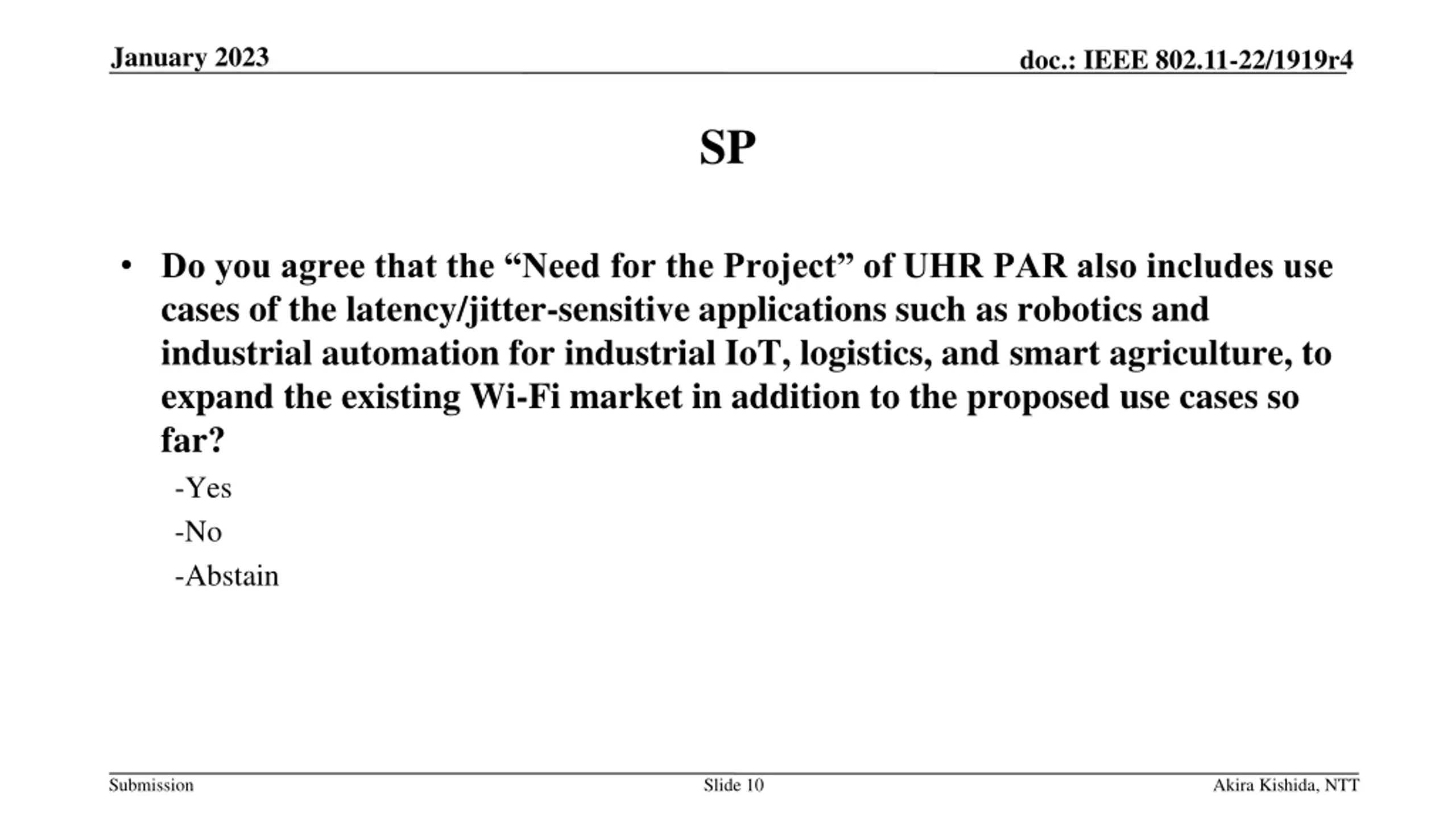 January 2023 doc.: IEEE 802.11-22/1919r4 SP Do you agree that the Need for the Project of UHR PAR also includes use cases of the latency/jitter-sensitive applications such as robotics and industrial automation for industrial IoT, logistics, and smart agriculture, to expand the existing Wi-Fi market in addition to the proposed use cases so far? -Yes -No -Abstain Submission Slide 10 Akira Kishida, NTT