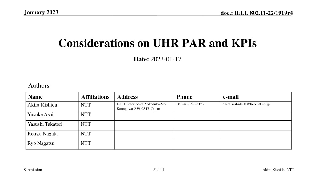 January 2023 doc.: IEEE 802.11-22/1919r4 Considerations on UHR PAR and KPIs Date: 2023-01-17 Authors: Name Akira Kishida Affiliations NTT Address 1-1, Hikarinooka Yokosuka-Shi, Kanagawa 239-0847, Japan Phone +81-46-859-2093 e-mail akira.kishida.fs@hco.ntt.co.jp Yusuke Asai NTT Yasushi Takatori NTT Kengo Nagata NTT Ryo Nagatsu NTT Submission Slide 1 Akira Kishida, NTT