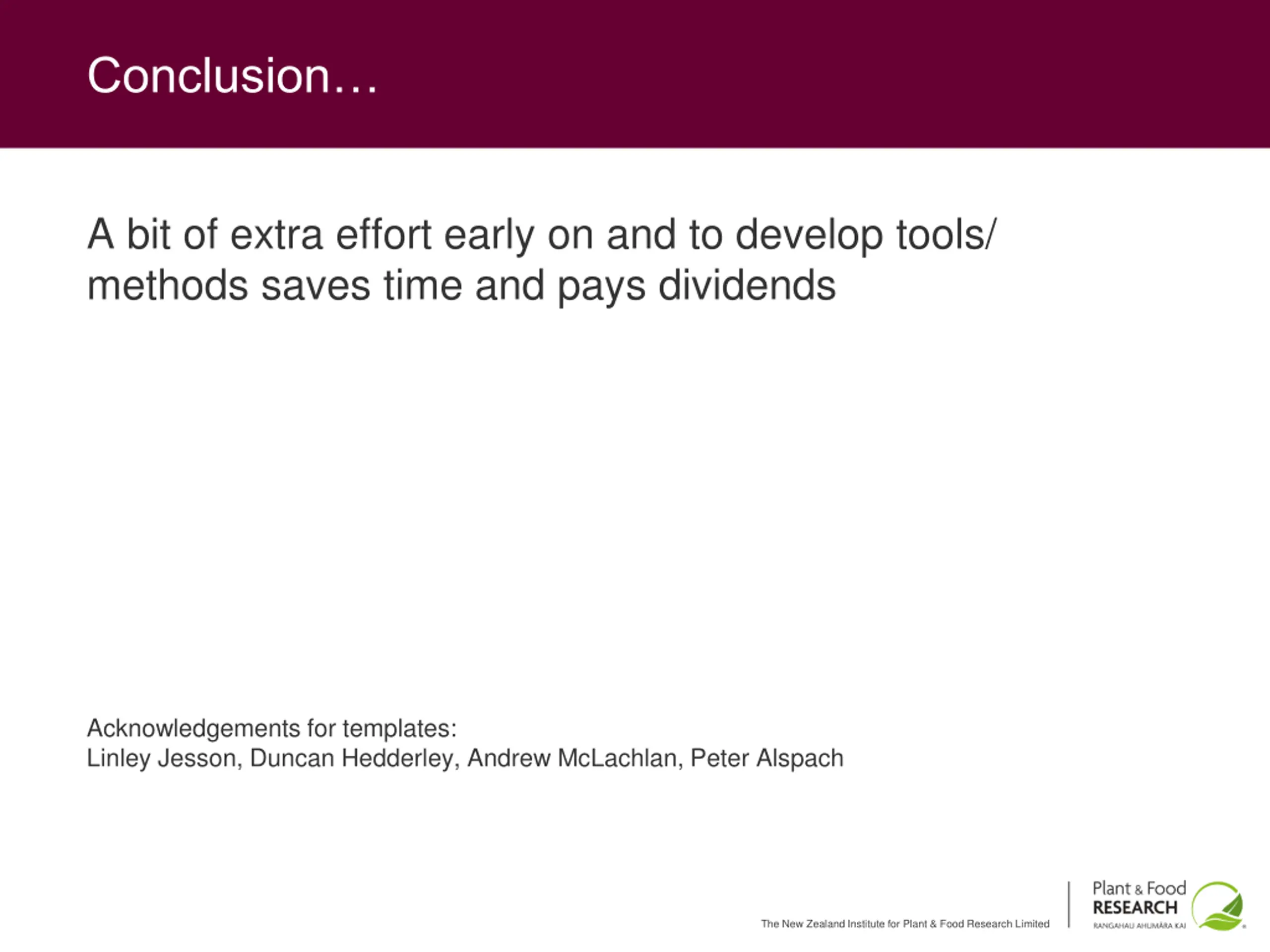 Conclusion A bit of extra effort early on and to develop tools/ methods saves time and pays dividends Acknowledgements for templates: Linley Jesson, Duncan Hedderley, Andrew McLachlan, Peter Alspach The New Zealand Institute for Plant & Food Research Limited