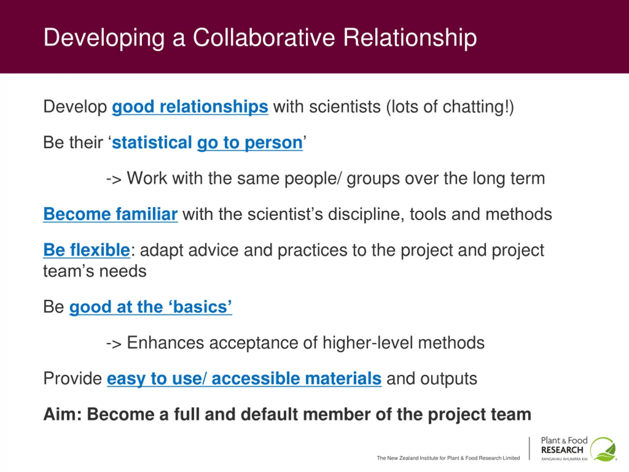Developing a Collaborative Relationship Develop good relationships with scientists (lots of chatting!) Be their statistical go to person -> Work with the same people/ groups over the long term Become familiarwith the scientist s discipline, tools and methods Be flexible: adapt advice and practices to the project and project team s needs Be good at the basics -> Enhances acceptance of higher-level methods Provide easy to use/ accessible materials and outputs Aim: Become a full and default member of the project team The New Zealand Institute for Plant & Food Research Limited