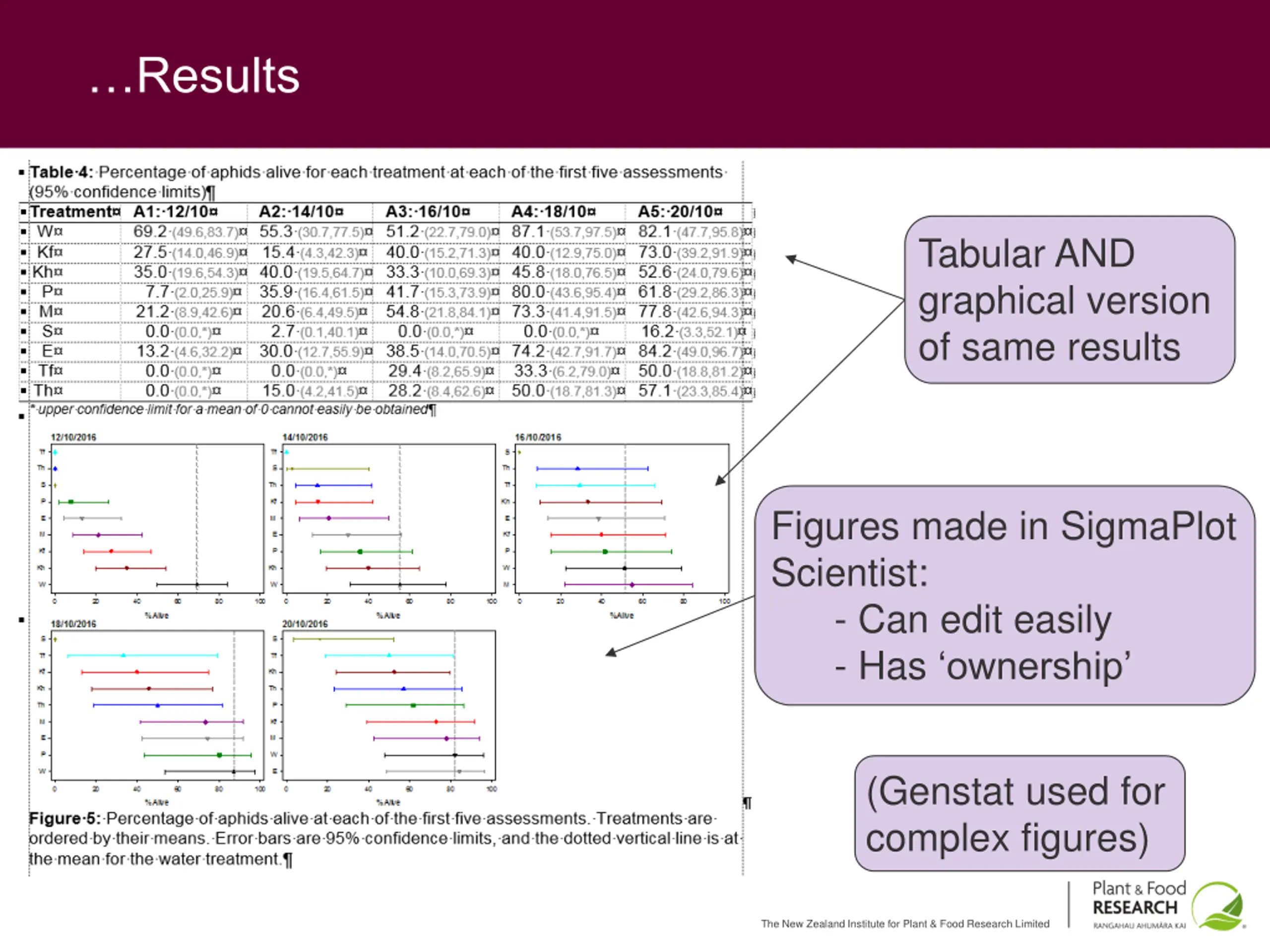 Results Tabular AND graphical version of same results Figures made in SigmaPlot Scientist: - Can edit easily - Has ownership (Genstat used for complex figures) The New Zealand Institute for Plant & Food Research Limited