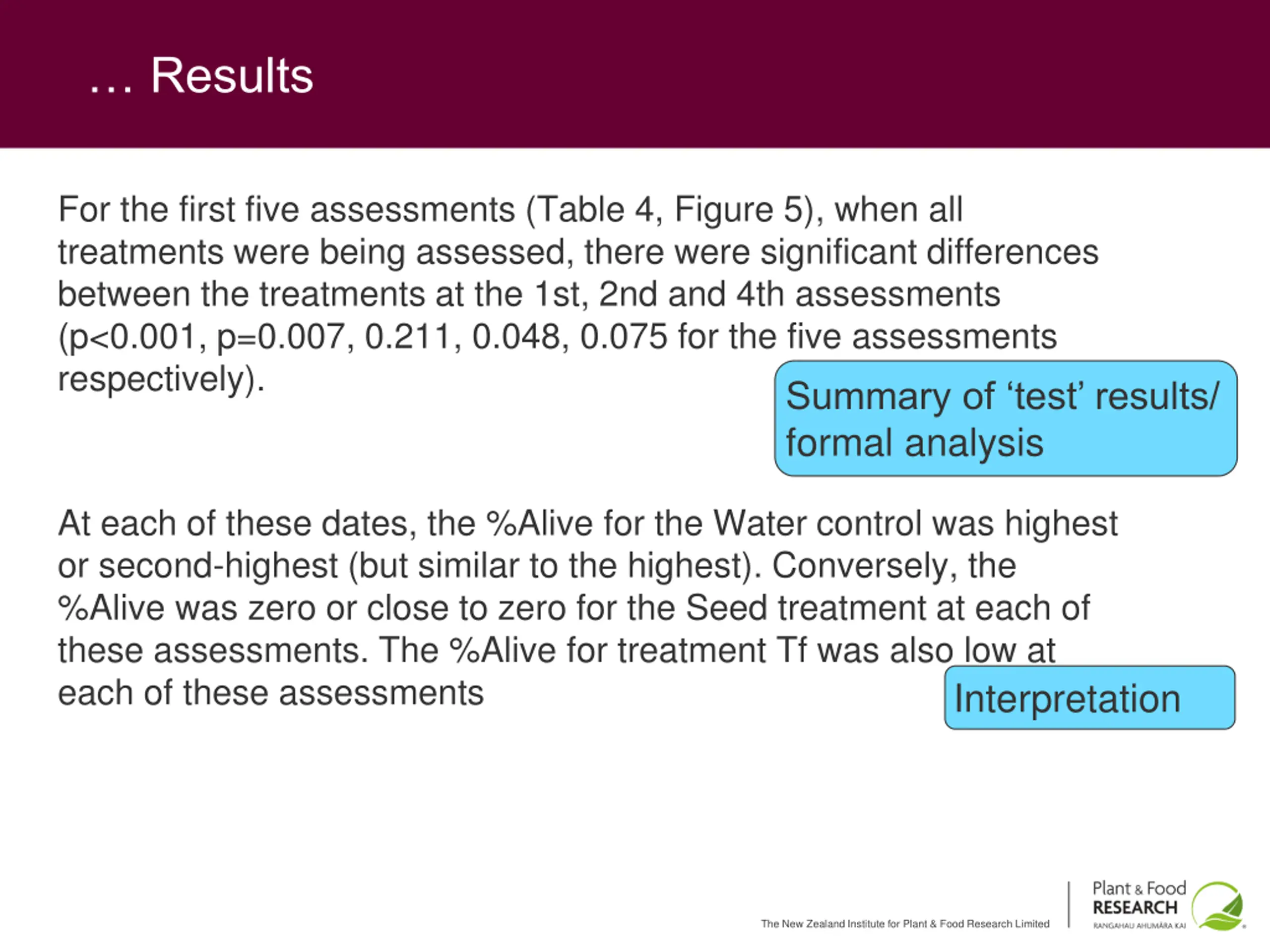 Results For the first five assessments (Table 4, Figure 5), when all treatments were being assessed, there were significant differences between the treatments at the 1st, 2nd and 4th assessments (p<0.001, p=0.007, 0.211, 0.048, 0.075 for the five assessments respectively). Summary of test results/ formal analysis At each of these dates, the %Alive for the Water control was highest or second-highest (but similar to the highest). Conversely, the %Alive was zero or close to zero for the Seed treatment at each of these assessments. The %Alive for treatment Tf was also low at each of these assessments Interpretation The New Zealand Institute for Plant & Food Research Limited