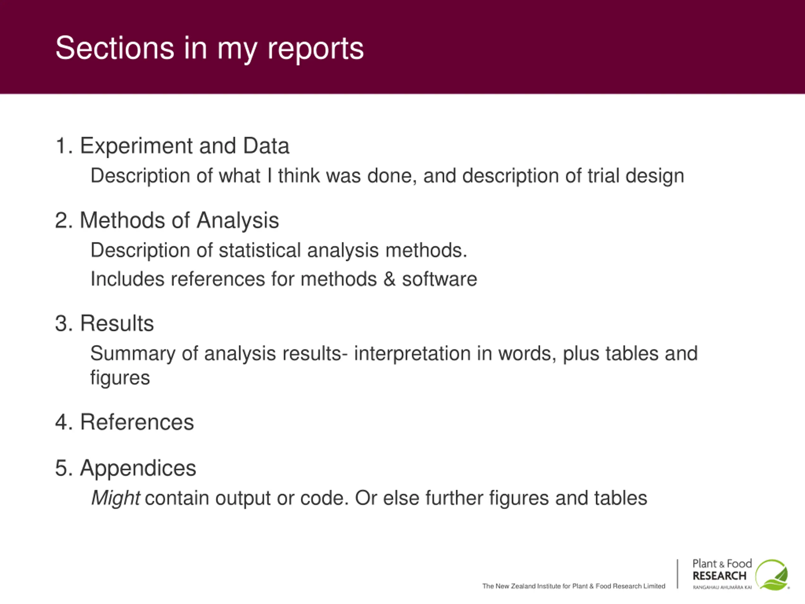 Sections in my reports 1. Experiment and Data Description of what I think was done, and description of trial design 2. Methods of Analysis Description of statistical analysis methods. Includes references for methods & software 3. Results Summary of analysis results- interpretation in words, plus tables and figures 4. References 5. Appendices Might contain output or code. Or else further figures and tables The New Zealand Institute for Plant & Food Research Limited