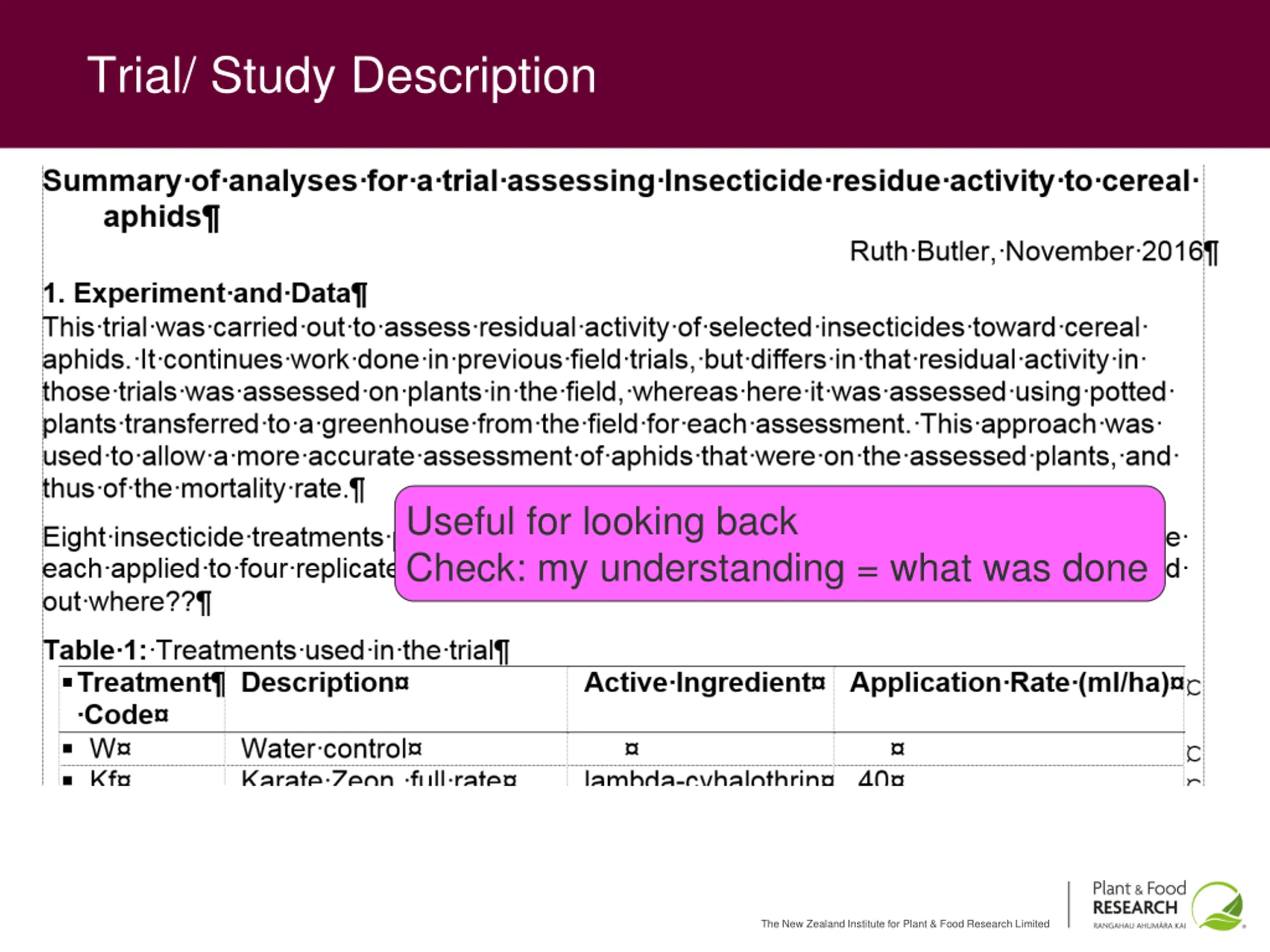 Trial/ Study Description Useful for looking back Check: my understanding = what was done The New Zealand Institute for Plant & Food Research Limited