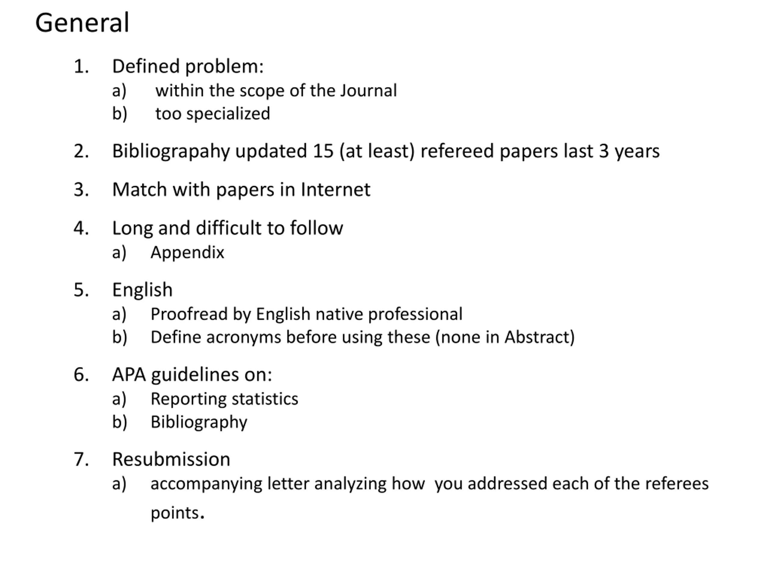 General 1. Defined problem: a) within the scope of the Journal b) too specialized 2. Bibliograpahy updated 15 (at least) refereed papers last 3 years 3. Match with papers in Internet 4. Long and difficult to follow a) Appendix 5. English a) b) Proofread by English native professional Define acronyms before using these (none in Abstract) 6. APA guidelines on: a) Reporting statistics b) Bibliography 7. Resubmission a) accompanying letter analyzing how you addressed each of the referees points.