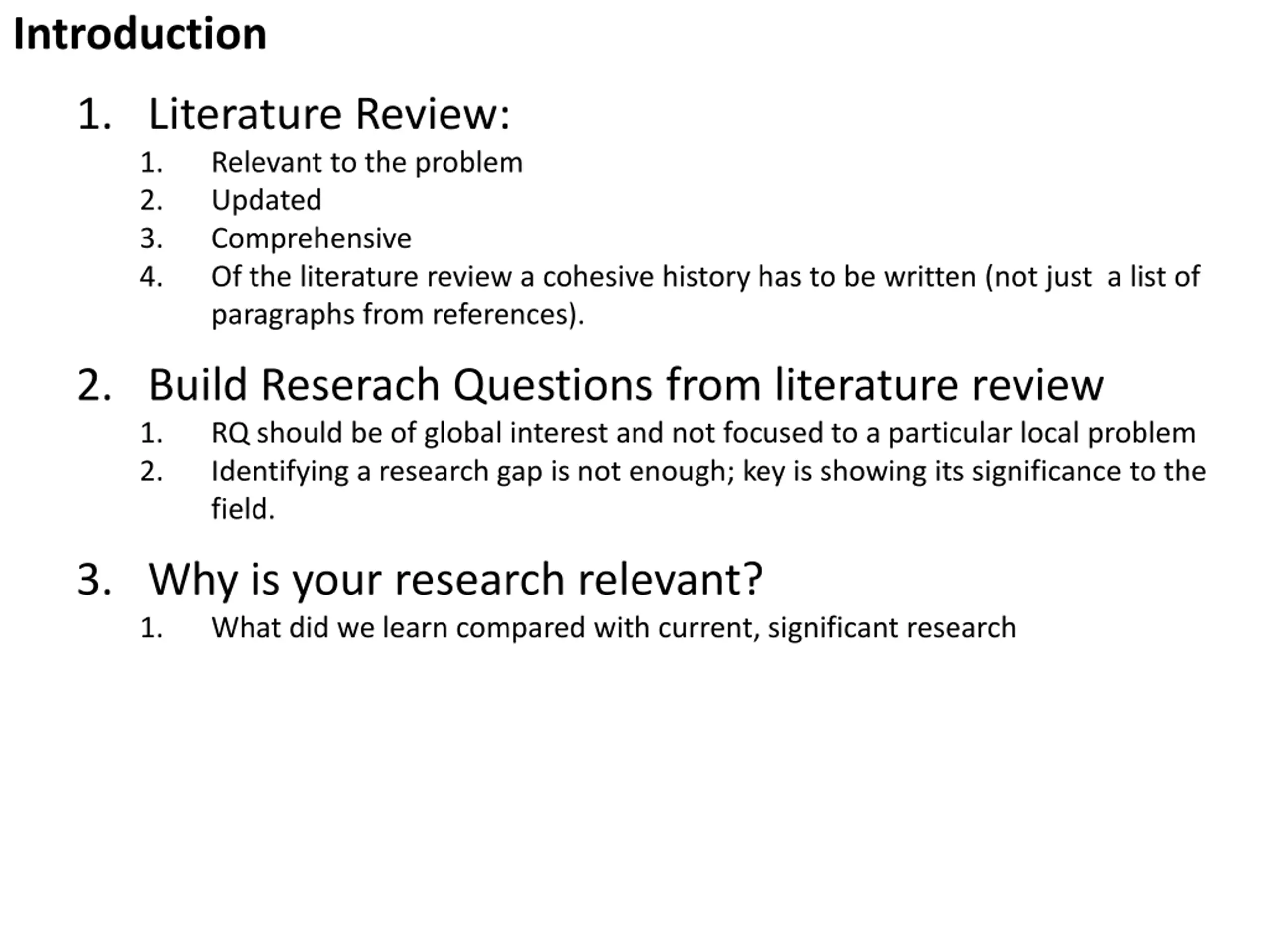 Introduction 1. Literature Review: 1. Relevant to the problem 2. Updated 3. Comprehensive 4. Of the literature review a cohesive history has to be written (not just a list of paragraphs from references). 2. Build Reserach Questions from literature review 1. RQ should be of global interest and not focused to a particular local problem 2. Identifying a research gap is not enough; key is showing its significance to the field. 3. Why is your research relevant? 1. What did we learn compared with current, significant research