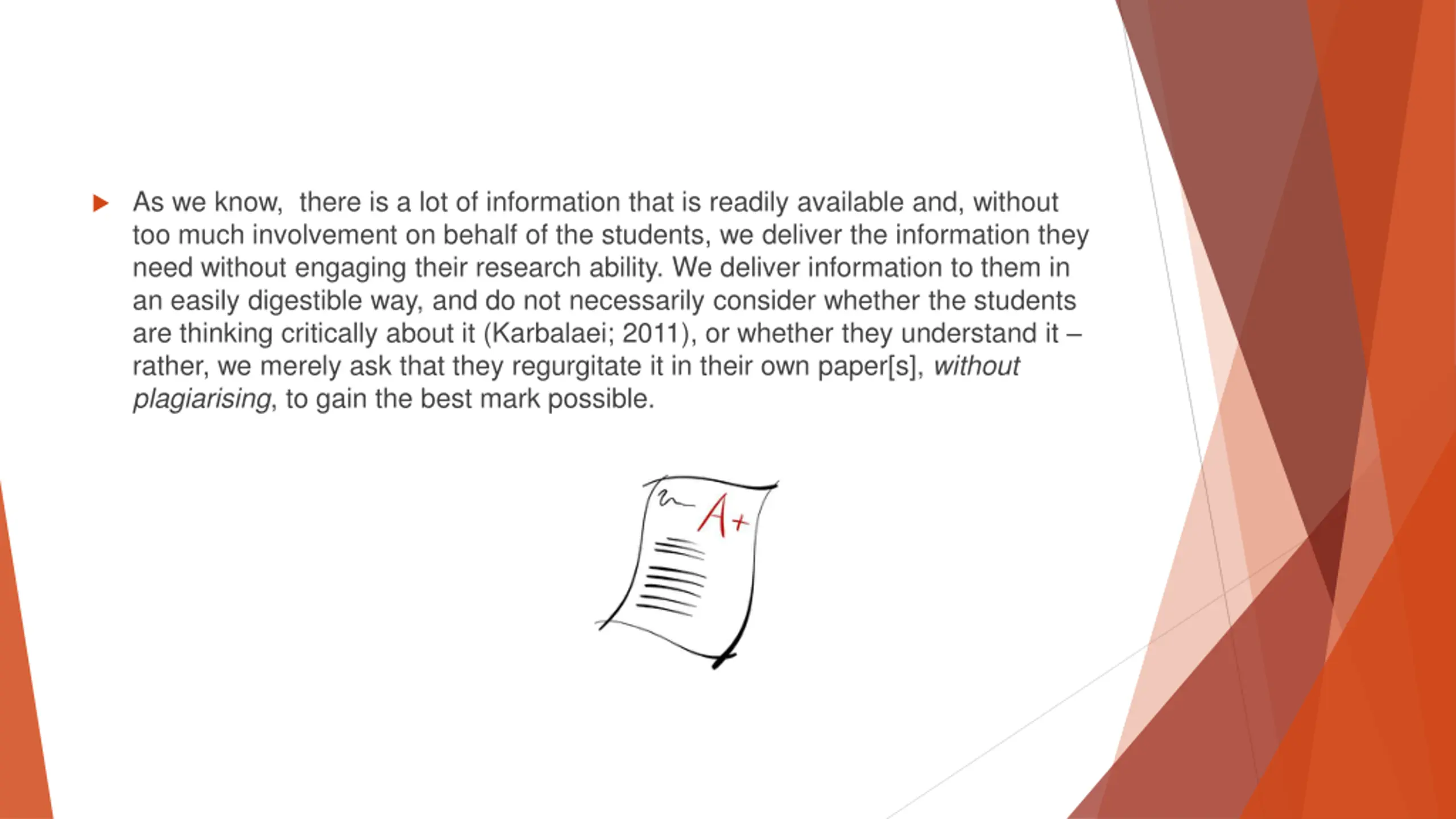 As we know, there is a lot of information that is readily available and, without too much involvement on behalf of the students, we deliver the information they need without engaging their research ability. We deliver information to them in an easily digestible way, and do not necessarily consider whether the students are thinking critically about it (Karbalaei; 2011), or whether they understand it rather, we merely ask that they regurgitate it in their own paper[s], without plagiarising, to gain the best mark possible.