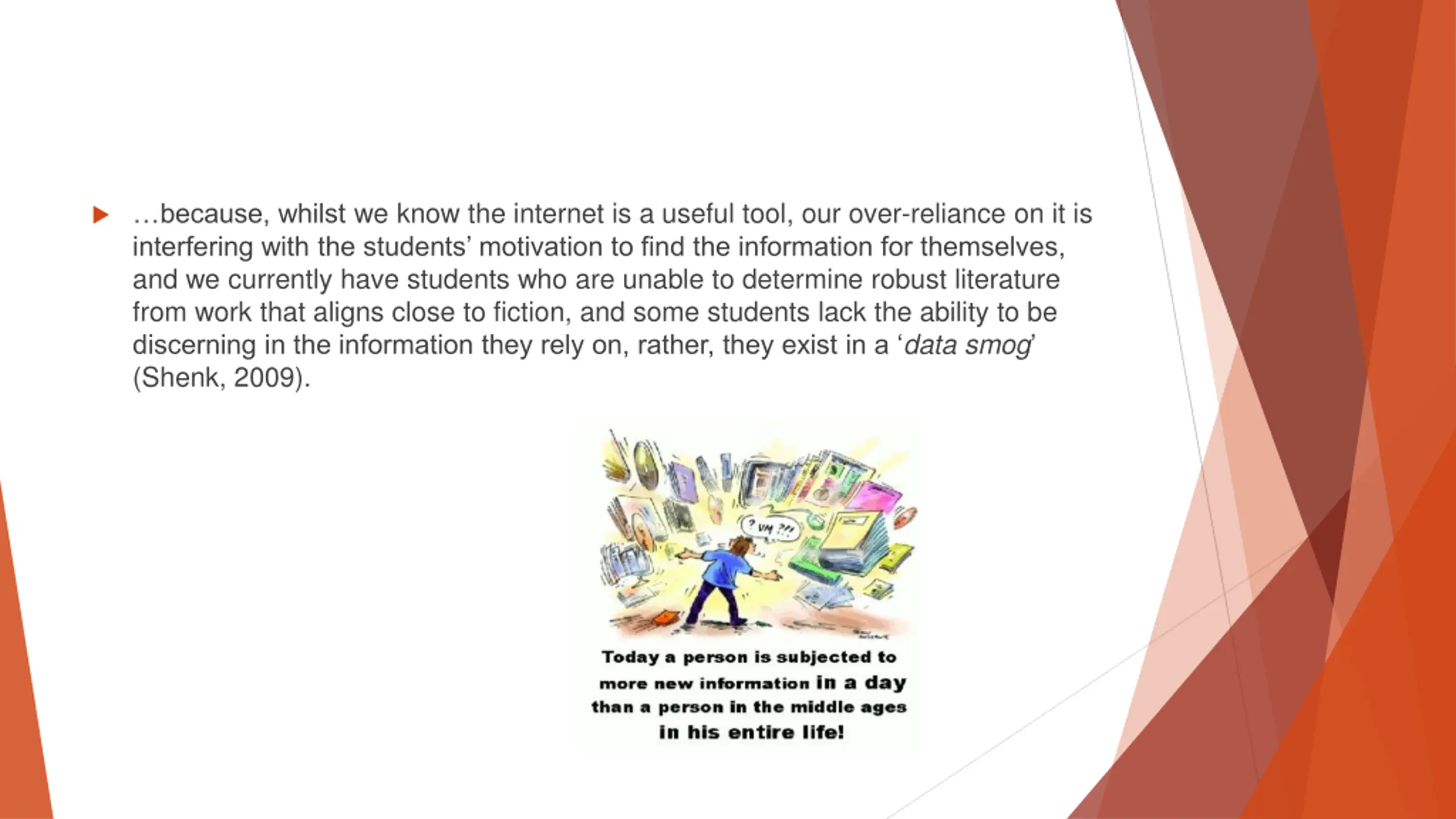 because, whilst we know the internet is a useful tool, our over-reliance on it is interfering with the students motivation to find the information for themselves, and we currently have students who are unable to determine robust literature from work that aligns close to fiction, and some students lack the ability to be discerning in the information they rely on, rather, they exist in a data smog (Shenk, 2009).