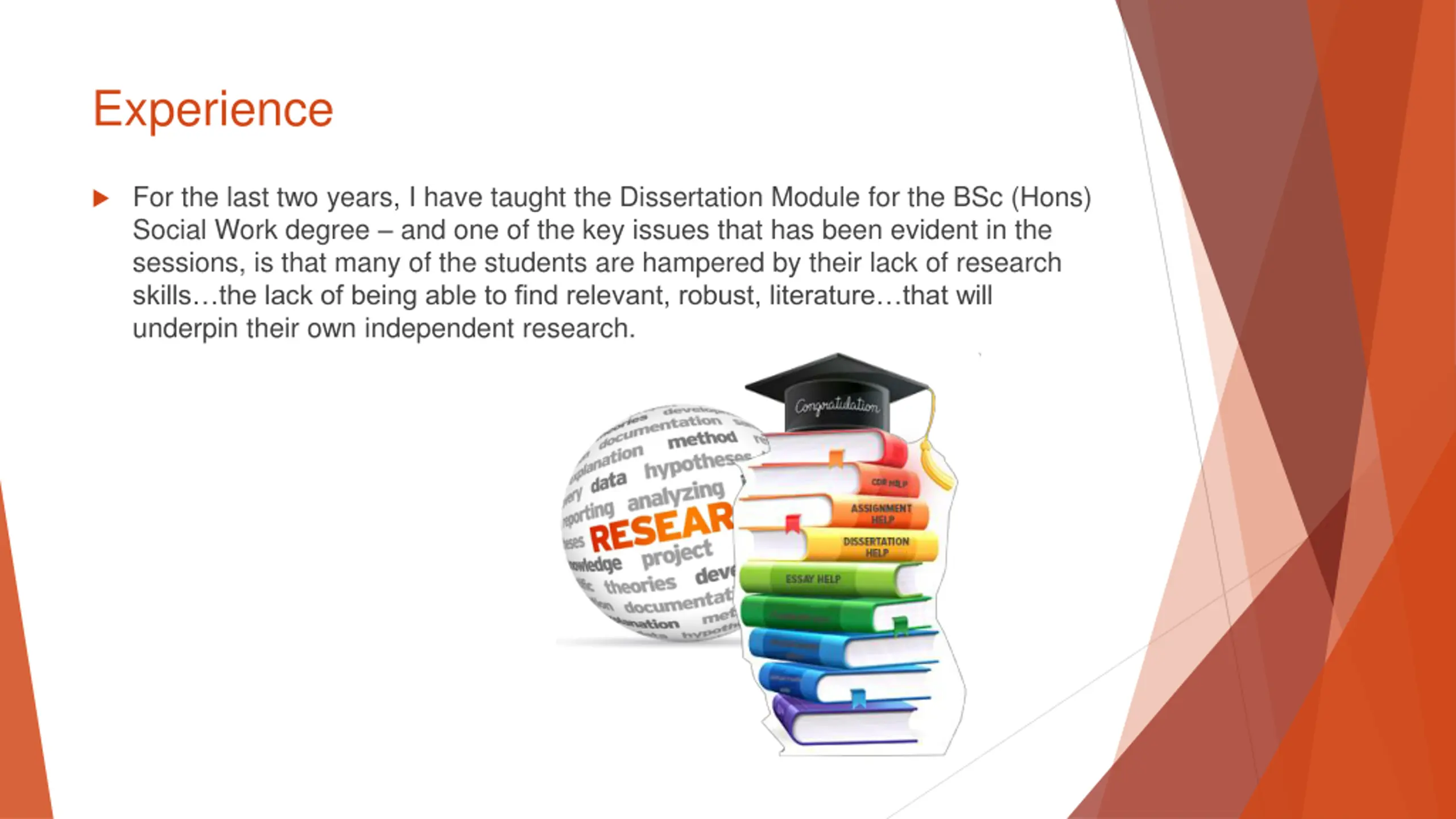 Experience For the last two years, I have taught the Dissertation Module for the BSc (Hons) Social Work degree and one of the key issues that has been evident in the sessions, is that many of the students are hampered by their lack of research skills the lack of being able to find relevant, robust, literature that will underpin their own independent research.